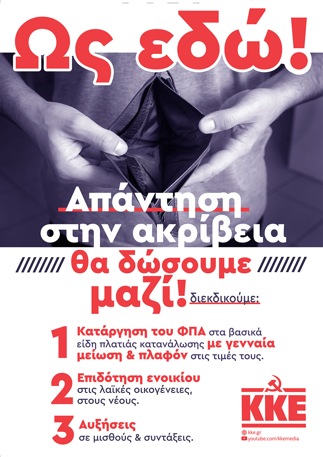 Δύο αφίσες που καλούν σε αγώνα και διεκδίκηση ενάντια στο κύμα ακρίβειας διακινούνται και τοιχοκολλούνται σε όλη τη χώρα από τις Κομματικές Οργανώσεις του ΚΚΕ. «Ως εδώ! Απάντηση στην ακρίβεια θα δώσουμε μαζί!», είναι το σύνθημα της μίας αφίσας που καλεί τον λαό να διεκδικήσει: