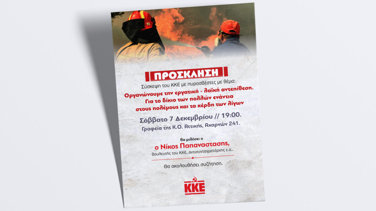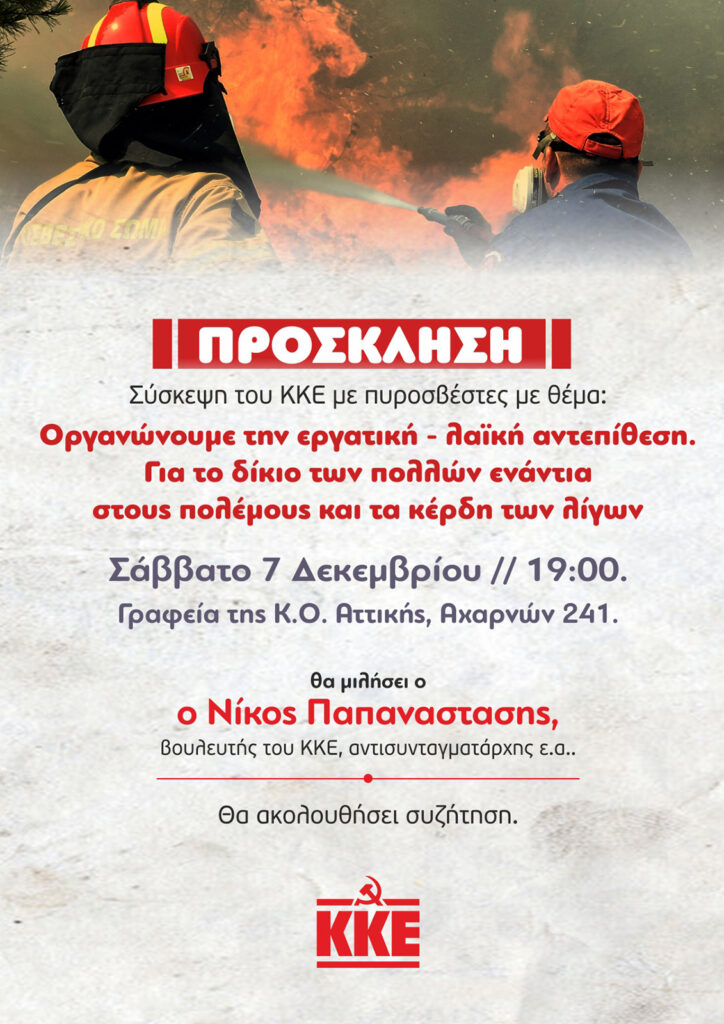 Σε σύσκεψη με θέμα «Οργανώνουμε την εργατική – λαϊκή αντεπίθεση. Για το δίκιο των πολλών ενάντια στους πολέμους και τα κέρδη των λίγων» καλεί τους πυροσβέστες το ΚΚΕ.