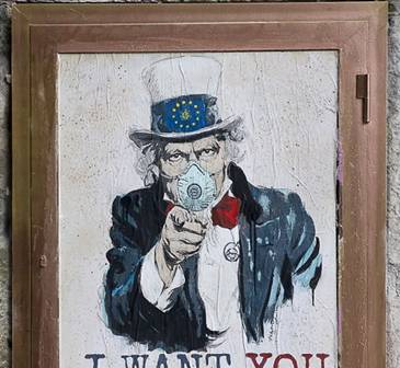 Στην Κοπεγχάγη, ο Andreas Welin -γνωστός ως Welinoo- φιλοτέχνησε την πιο διαδεδομένη απεικόνιση του ιού, η οποία θυμίζει αμυδρά το πρόσωπο του 45ου Προέδρου των ΗΠΑ.