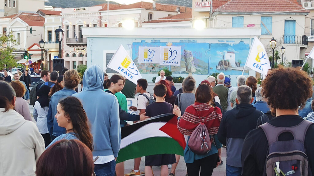 Εκεί, ο πρόεδρος της Επιτροπής Ειρήνης Λέσβου, Νάσος Γαλής, ευχαρίστησε τους παρευρισκόμενους για την παρουσία τους και για την ανταπόκρισή τους στο κάλεσμα της επιτροπής. Έστειλε τα πιο θερμά μηνύματα συμπαράστασης και αλληλεγγύης στον αγωνιζόμενο Παλαιστινιακό λαό, κατήγγειλε τα πολεμικά σχέδια των ιμπεριαλιστών και τα διαρκώς αυξανόμενα εγκλήματα τους, και έκλεισε ραντεβού για τους επόμενους αγώνες που μας περιμένουν.