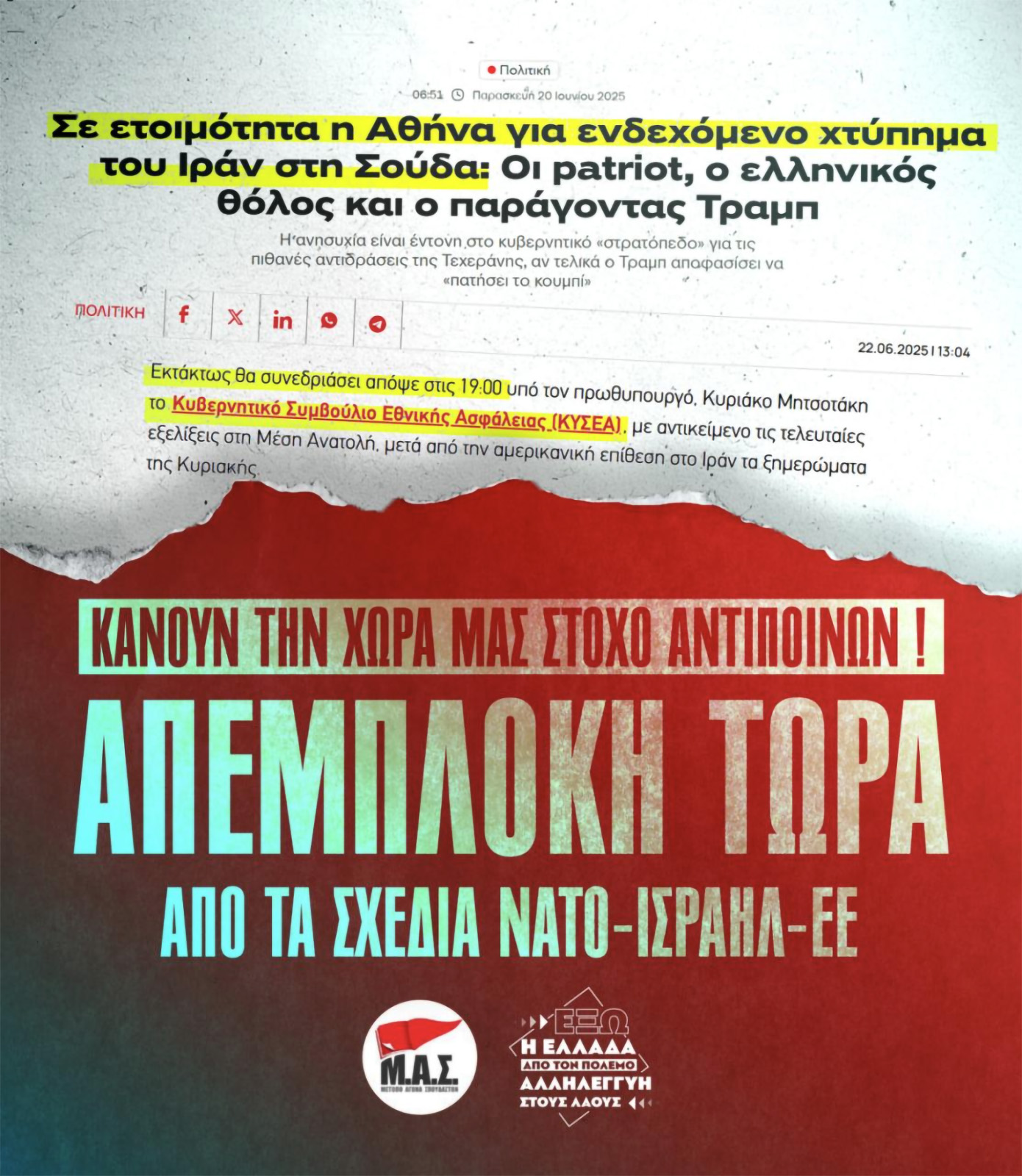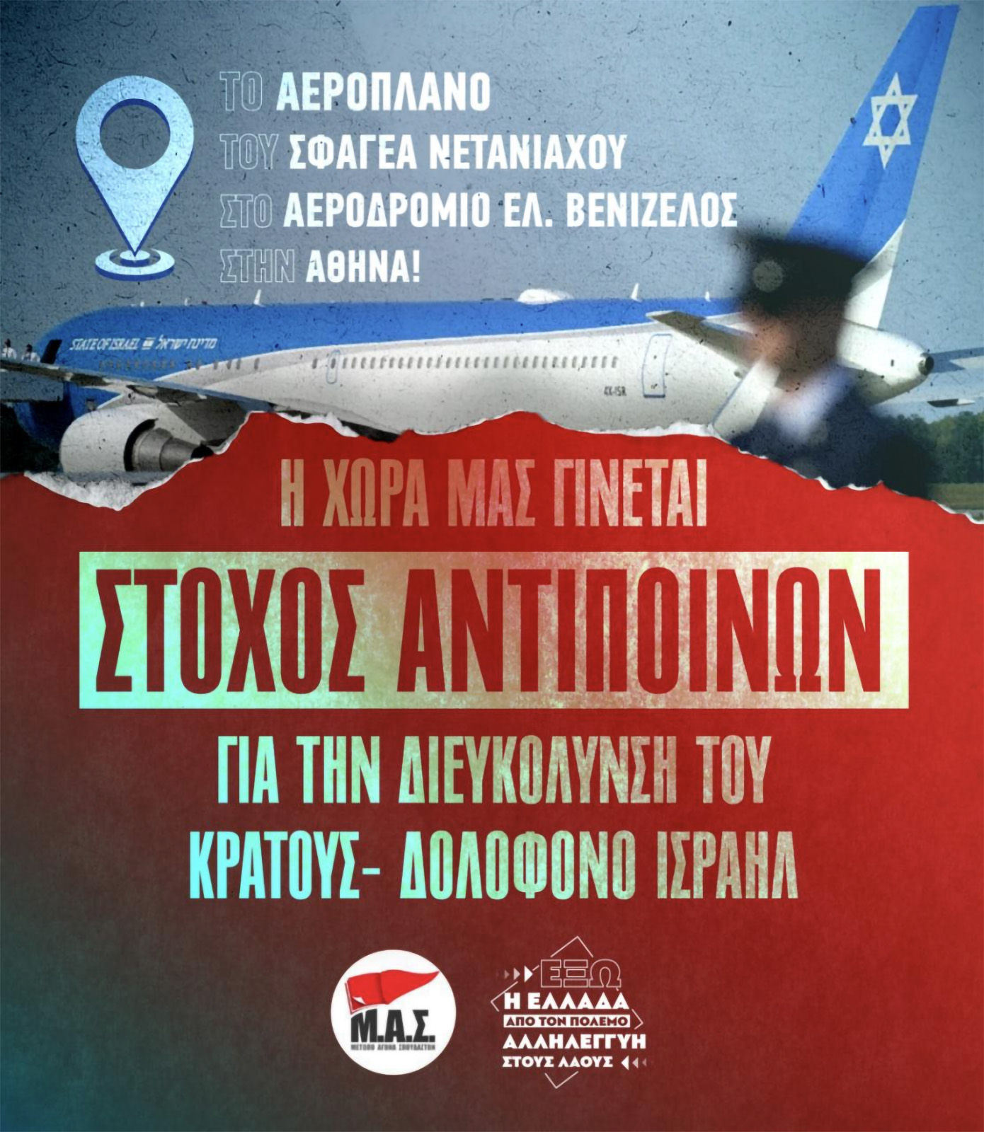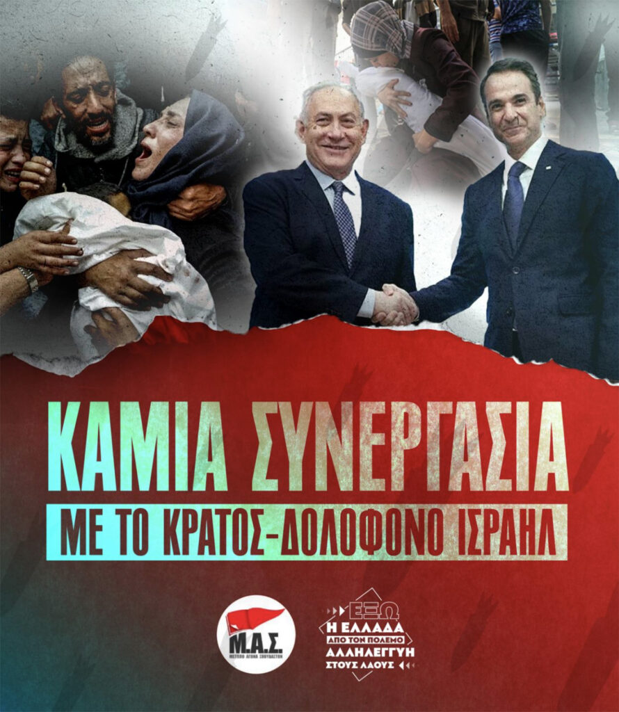 Απαιτούμε τώρα την άμεση διακοπή κάθε σχέσης της ελληνικής κυβέρνησης με το κράτος – δολοφόνο του Ισραήλ. Η χώρα μας να μην είναι ούτε ορμητήριο του ΝΑΤΟ, ούτε θύτης άλλων λαών στηρίζοντας τις δολοφονικές επιχειρήσεις που διεξάγουν οι ΗΠΑ και το Ισραήλ απέναντι σε άλλους λαούς», σημειώνει το ΜΑΣ.