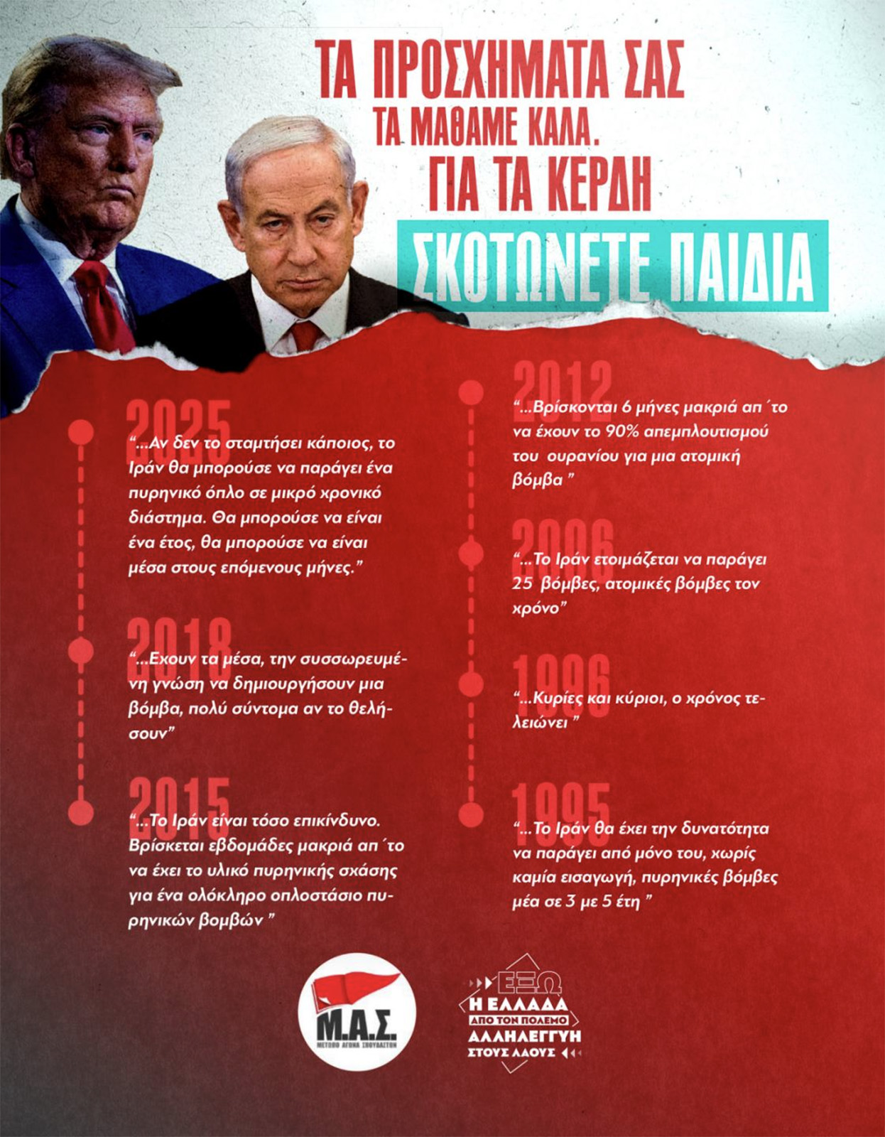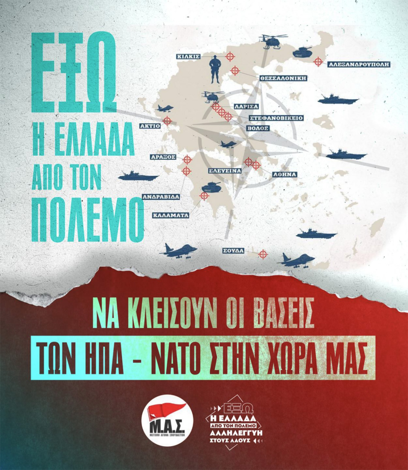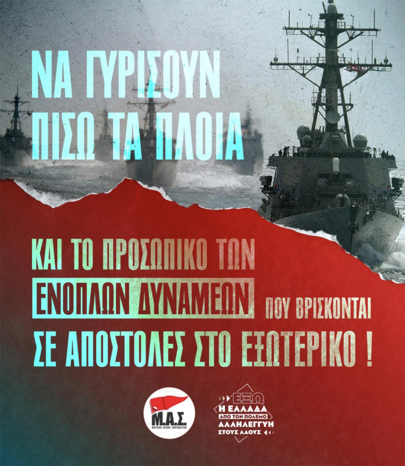 Απαιτούμε τώρα την άμεση διακοπή κάθε σχέσης της ελληνικής κυβέρνησης με το κράτος – δολοφόνο του Ισραήλ. Η χώρα μας να μην είναι ούτε ορμητήριο του ΝΑΤΟ, ούτε θύτης άλλων λαών στηρίζοντας τις δολοφονικές επιχειρήσεις που διεξάγουν οι ΗΠΑ και το Ισραήλ απέναντι σε άλλους λαούς», σημειώνει το ΜΑΣ.