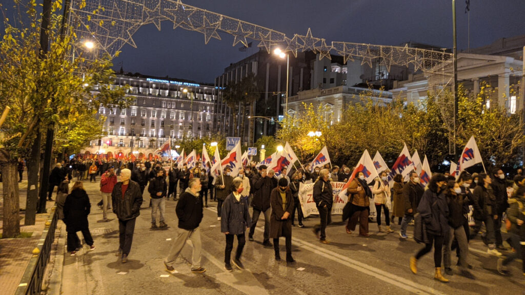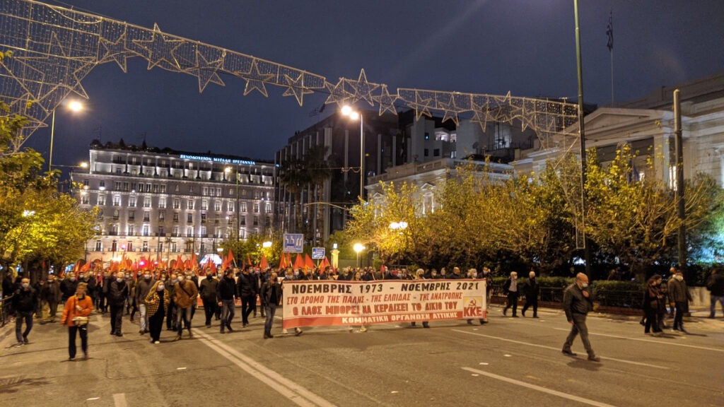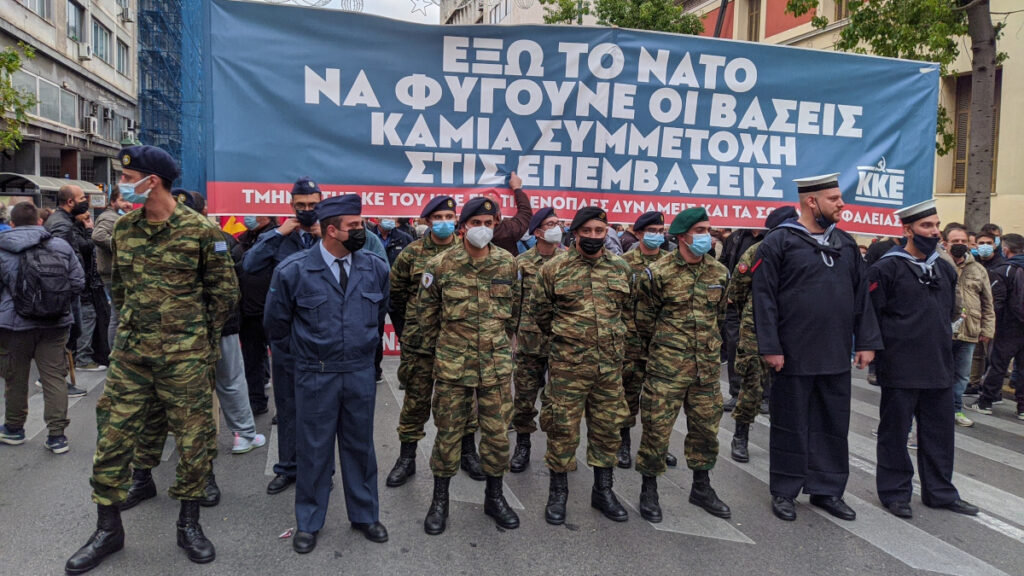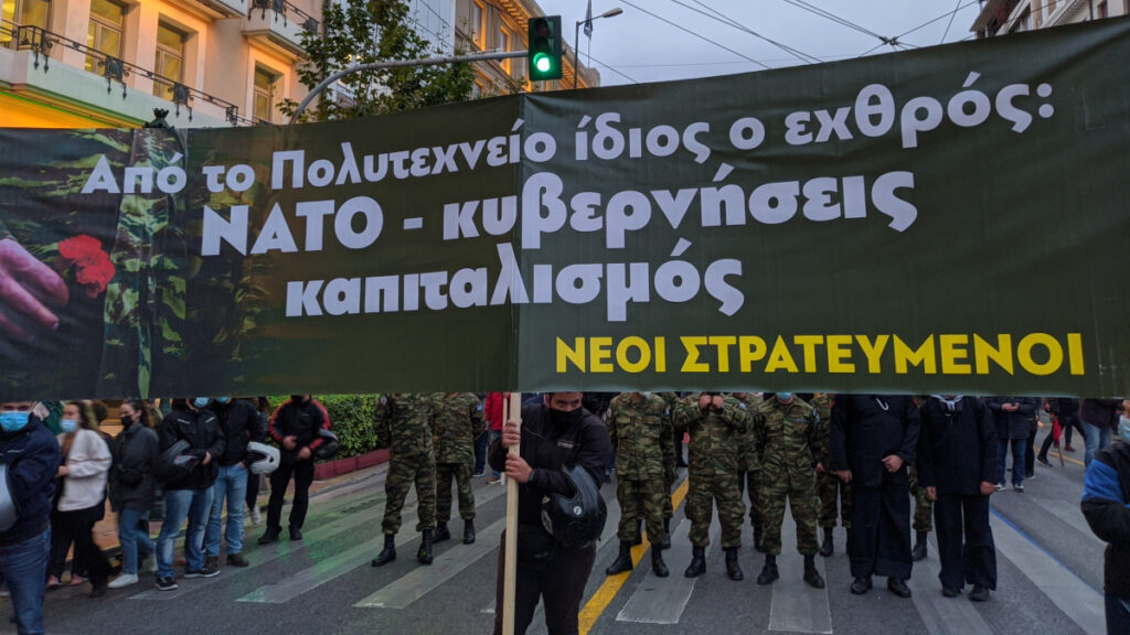 «Από το Πολυτεχνείο ίδιος ο εχθρός: ΝΑΤΟ – κυβερνήσεις – καπιταλισμός», γράφει το πανό των στρατευμένων.
