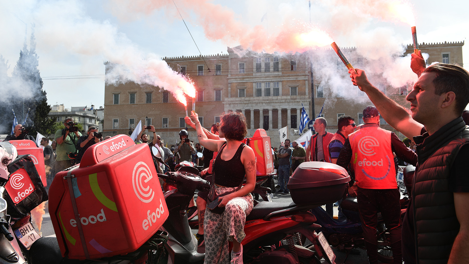 Στο Σύνταγμα διαδήλωσαν και οι διανομείς της «e-food» και της «wolt», οι οποίοι έκαναν και μοτοπορεία.