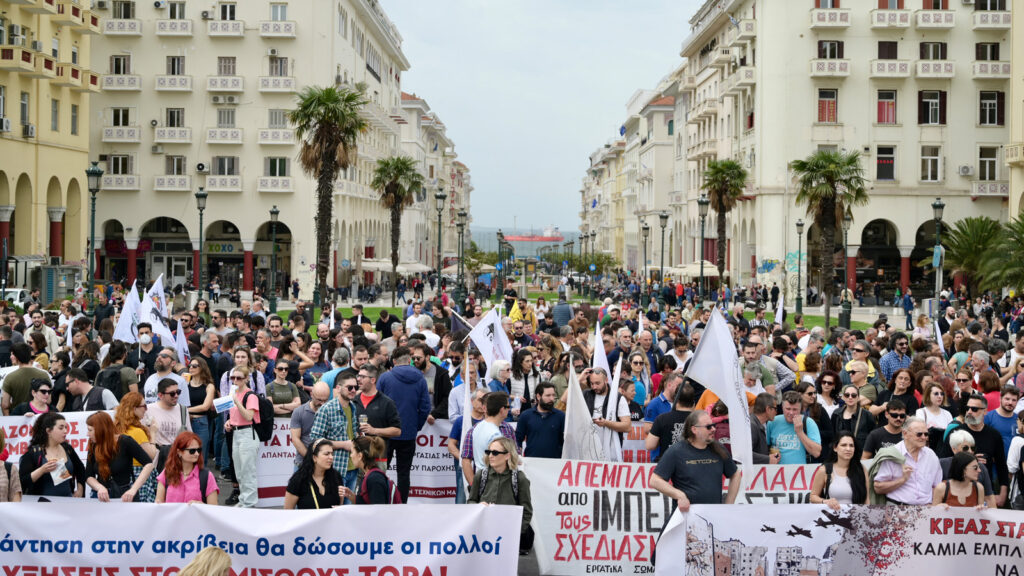 Μεγάλη, μαζική και δυναμική πορεία στη Θεσσαλονίκη με συνθήματα όπως «Κουπόνια για το ρεύμα, κουπόνια για φαΐ, σε λίγο θα μας δώσετε κουπόνια για ζωή», «Εδώ, εδώ με αγώνα ταξικό, γιατί εμείς δεν ζούμε με 400 ευρώ», «Τα λεφτά στις τσέπες μας γίνονται καπνός, οι μισθοί τελειώνουν στις 10 του μηνός», «Πανάκριβα τα πάντα, πανάκριβη ζωή, οργάνωση κι αγώνας η μόνη επιλογή», ακούγονται δυνατά στην πόλη.