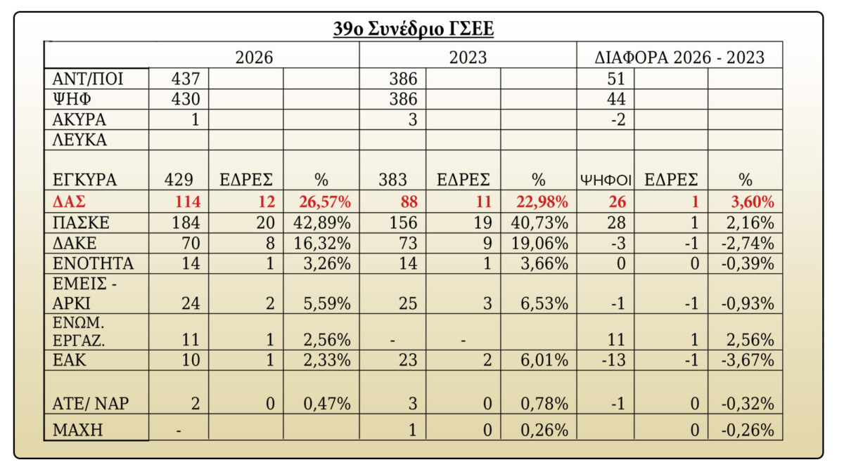 Μεγάλη άνοδος σε ψήφους, ποσοστά και έδρες καταγράφει η ΔΑΣ μετά το 39ο Συνέδριο της ΓΣΕΕ.