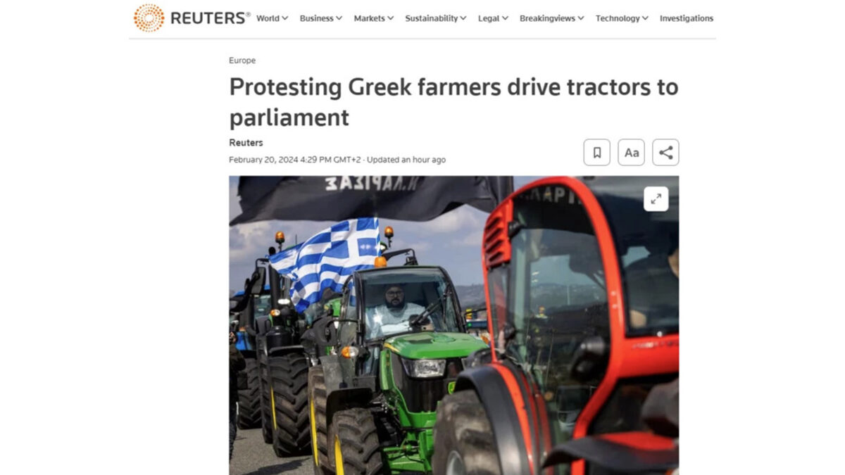 «Αγρότες από όλη την Ελλάδα οδήγησαν τα τρακτέρ τους στην Αθήνα την Τρίτη, εντείνοντας τις διαδηλώσεις εβδομάδων με αιτήματα την αύξηση του κόστους, τον ξένο ανταγωνισμό και τις καταστροφικές πλημμύρες», γράφει το «Reuters». «Καθώς οδηγούσαν στους δρόμους της πρωτεύουσας, κόρναραν στις επευφημίες των περαστικών. Δεκάδες τρακτέρ στάθμευσαν μπροστά στο κοινοβούλιο ενώ αναμένεται να καταφτάσουν κι άλλα», μεταδίδει.