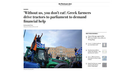 «”Χωρίς εμάς δεν τρώτε” – Ελληνες αγρότες οδηγούν περίπου 200 τρακτέρ στην Αθήνα για να ζητήσουν οικονομική βοήθεια», γράφει και η «Washington Post» και εξηγεί στο ρεπορτάζ της ότι «Ελληνες αγρότες οδήγησαν την Τρίτη περίπου 200 τρακτέρ στην Αθήνα, ζητώντας οικονομική βοήθεια από την κυβέρνηση καθώς το κόστος ζωής αυξήθηκε στη μεσογειακή χώρα».