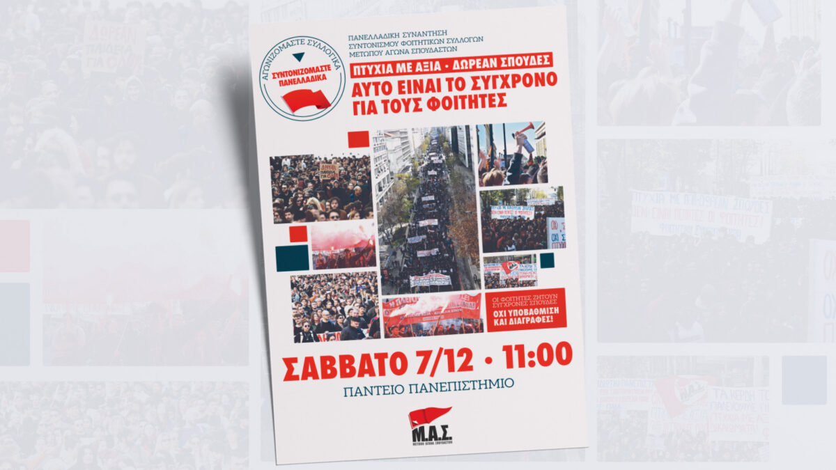 Σήμερα, Σάββατο 7 Δεκέμβρη, στο Πάντειο Πανεπιστήμιο πραγματοποιείται η Πανελλαδική Συνάντηση Συντονισμού Φοιτητικών Συλλόγων του Μετώπου Αγώνα Σπουδαστών.
