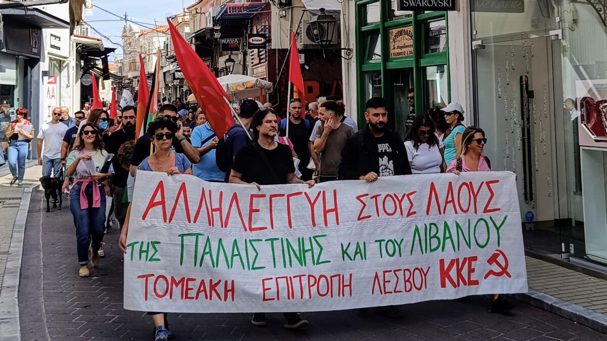 Επίσης, να αποσυρθεί κάθε στήριξη της ελληνικής κυβέρνησης στο κράτος – δολοφόνο Ισραήλ και να απεμπλακεί η χώρα μας από τους ιμπεριαλιστικούς πολέμους. Να κλείσουν οι αμερικανοΝΑΤΟικές βάσεις και υποδομές. Ενώ κάλεσαν τον Λεσβιακό λαό να δείξει την αμέριστη αλληλεγγύη του προς τους λαούς της Παλαιστίνης και του Λιβάνου.