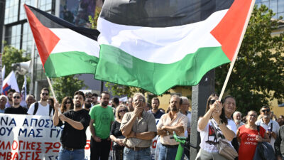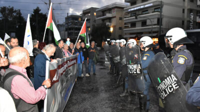 — Καμία στήριξη στο κράτος – δολοφόνο Ισραήλ, λευτεριά στον αγωνιζόμενο Παλαιστινιακό λαό».