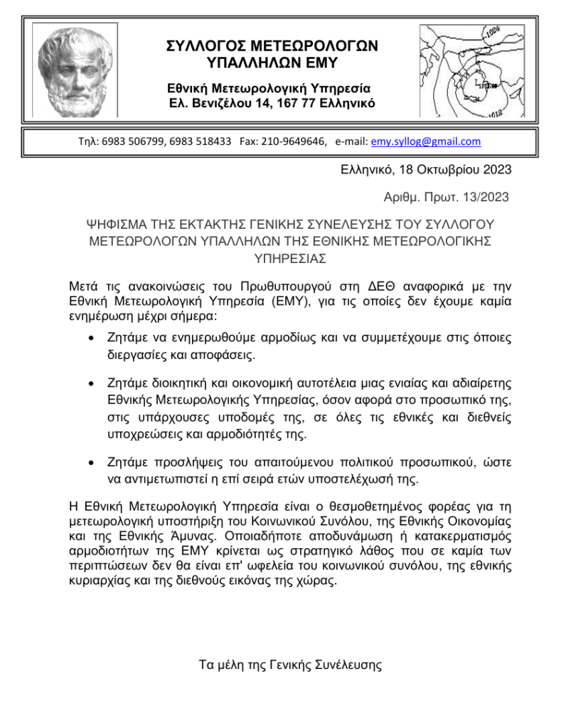 Οι βουλευτές του ΚΚΕ, Κατσώτης Χρήστος, Καραθανασόπουλος Νίκος, Μανωλάκου Διαμάντω, Μαρίνος Γιώργος, Παπαναστάσης Νίκος και Παφίλης Θανάσης κατέθεσαν αναφορά προς τον υπουργό Άμυνας το ψήφισμα της έκτακτης Γενικής Συνέλευσης του Συλλόγου Μετεωρολόγων Υπαλλήλων της Εθνικής Μετεωρολογικής Υπηρεσίας ώστε να μην αποδυναμωθεί η ΕΜΥ και να μην κατακερματιστούν οι αρμοδιότητες της.