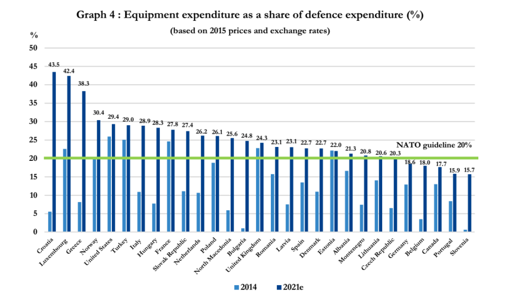 Είναι γνωστό ότι από πολλά χρόνια η λυκοσυμμαχία έχει θέσει ως στόχο κάθε χρόνο το 20% των στρατιωτικών δαπανών κάθε χώρας, να ξοδεύεται για νέους εξοπλισμούς. Έτσι σε άλλο γράφημα (4) του νατοϊκού κειμένου προκύπτουν τα ποσοστά επί των συνολικών στρατιωτικών δαπανών, που θα ξοδευτούν για την απόκτηση νέων οπλικών συστημάτων. Συγκεκριμένα φέτος, το ποσοστό αυτό για την Ελλάδα αναμένεται ότι θα φθάσει το 38,3% των συνολικών δαπανών. Έτσι η χώρα κατατάσσεται στην τρίτη θέση ανάμεσα στις χώρες – μέλη του ΝΑΤΟ. Η Τουρκία αντίστοιχα βρίσκεται στην έκτη θέση με 29%, ενώ η πλειοψηφία των νατοϊκών χωρών «πετυχαίνει» τον στόχο της λυκοσυμμαχίας.