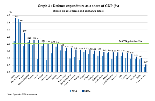 Στο γράφημα 3 του νατοϊκού κειμένου, παρουσιάζονται οι στρατιωτικές δαπάνες των χωρών, ως ποσοστό επί του Ακαθαρίστου Εγχώριου Προϊόντος (ΑΕΠ – GDP), για τα έτη 2014-2021.