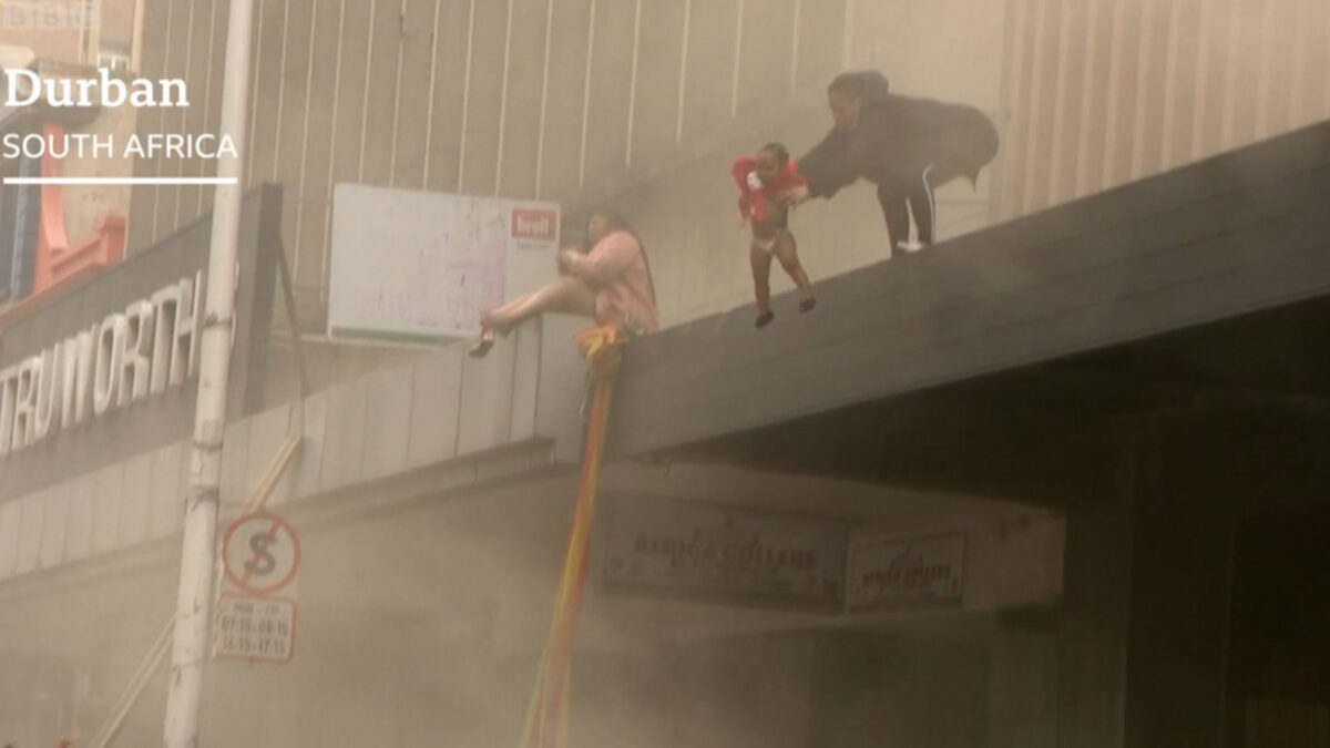 Ένα κοριτσάκι δύο ετών επέζησε χωρίς να τραυματιστεί καθώς η μητέρα του, στην προσπάθειά της να δραπετεύσει με την κόρη της από ένα φλεγόμενο πολυώροφο κτίριο στην πόλη Ντέρμπαν στη Νότια Αφρική, την πέταξε σε μια ομάδα ανθρώπων που βρίσκονταν από κάτω και το έπιασαν.
