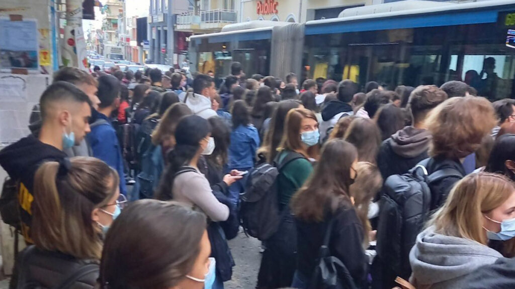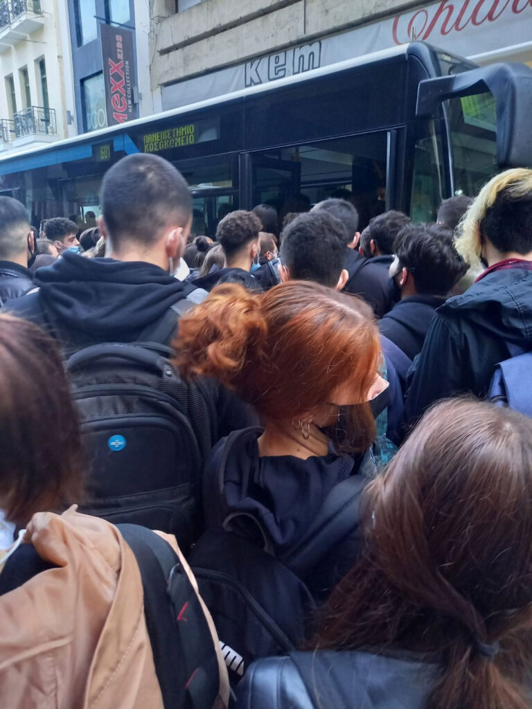- Ο συνωστισμός, όμως, δεν περιορίστηκε μόνο στα πλαίσια των ιδρυμάτων καθώς οι φοιτητές αναγκάζονται να στοιβάζονται σαν σαρδέλες στα ΜΜΜ μέχρι να φτάσουν στις σχολές τους. Αυτό δεν αφορά μόνο τα λεωφορεία και τα μετρό της Αθήνας αλλά τέτοιες απαράδεκτες εικόνες σημειώθηκαν και στην Πάτρα όπου ο δρόμος είχε γεμίσει με φοιτητές γιατί δεν χωρούσαν στο πεζοδρόμιο! (φωτο από συνωστισμό στα μέσα)