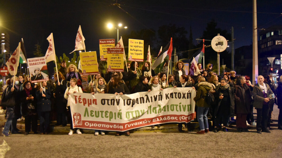 Με διαμαρτυρία στην ισραηλινή πρεσβεία η Ομοσπονδία Γυναικών Ελλάδας διαδήλωσε το απόγευμα σήμερα Δευτέρα 25 Νοεμβρίου την αλληλεγγύη της στους γυναίκες της Παλαιστίνης, με αφορμή την Παγκόσμια Μέρα για την εξάλειψη της βίας κατά των γυναικών.