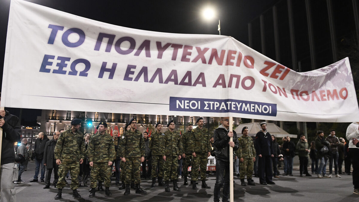 Λένε μαζί τους τα συνθήματα «Έξω το ΝΑΤΟ, να φύγουνε οι βάσεις, καμιά συμμετοχή στις επεμβάσεις» και τους φωνάζουν: «Είμαστε μαζί σας! Μη λυγίζετε!».
