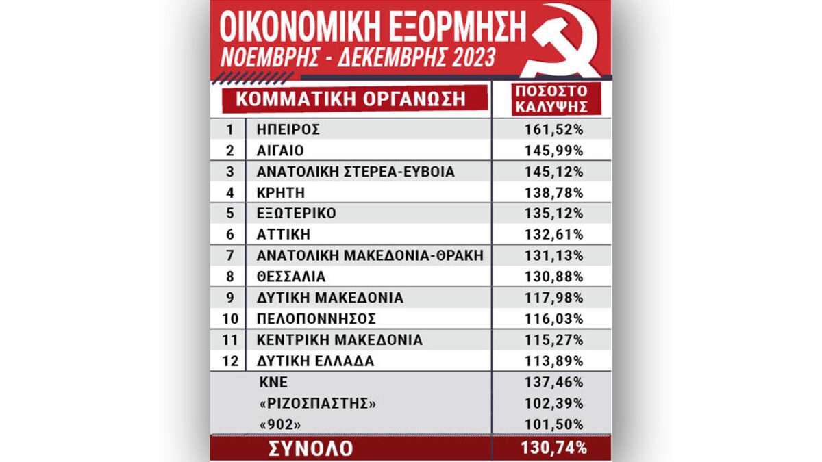 Με επιτυχία ολοκληρώθηκε η Οικονομική Εξόρμηση του ΚΚΕ, με το συνολικό πλάνο να υπερκαλύπτεται κατά 130,74%. Επίσης όλες οι Οργανώσεις Περιοχής υπερκάλυψαν τα δικά τους πλάνα, όπως και η ΚΝΕ. Σε πανηγυρικό κλίμα πραγματοποιήθηκε το τελευταίο κατά σειρά οικονομικό «κλείσιμο» τη Δευτέρα 29 Γενάρη.