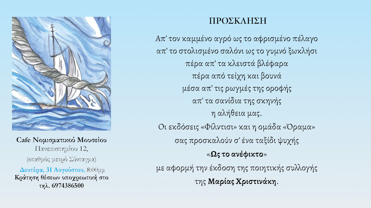 Η πρώτη ποιητική συλλογή της Μαρίας Χριστινάκη «Ως το ανέφικτο» από τις εκδόσεις «Φίλντισι» παρουσιάζεται, ως θεατρικό δρώμενο από την θεατρική ομάδα Όραμα, στο Cafe Νομισματικού Μουσείου, Πανεπιστημίου 12 (σταθμός μετρό Σύνταγμα), την Δευτέρα 31 Αυγούστου στις 8μμ. Ένα ταξίδι ψυχής