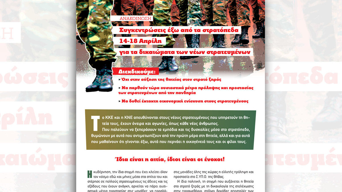 Καλούν ακόμα τους στρατευμένους να πουν «όχι στην καταστολή και τον αυταρχισμό!», στα σχέδια για αξιοποίηση των Ενόπλων Δυνάμεων απέναντι στο λαό, να δυναμώσουν την πάλη για αποδέσμευση από το ΝΑΤΟ και την Ευρωπαϊκή Ενωση. Να κλείσουν τώρα η Σούδα και όλες οι ξένες βάσεις.