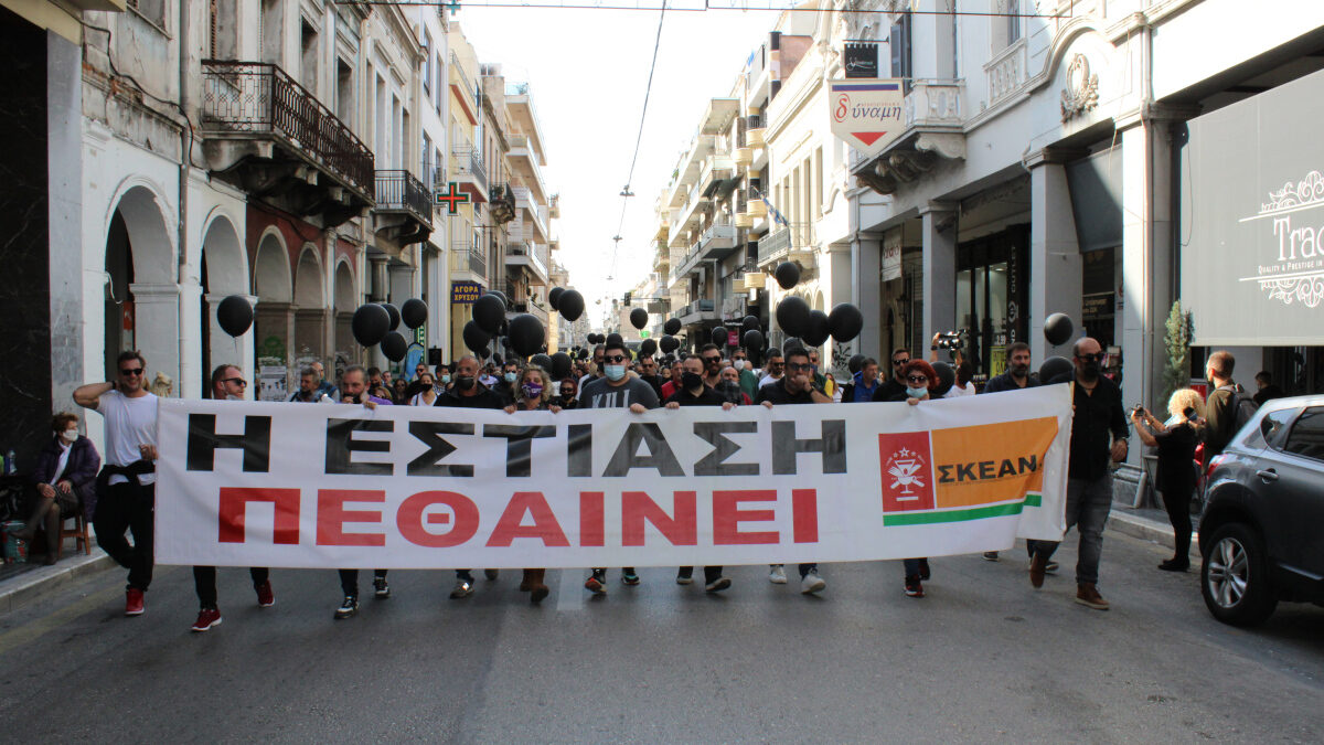 Με κεντρικό σύνθημα «Η εστίαση πεθαίνει» και «η τέχνη μας στο δρόμο, παλεύουμε, διεκδικούμε, απεργούμε», ιδιοκτήτες καταστημάτων εστίασης κουρείων – κομμωτηρίων συμμετείχαν σε συγκέντρωση διαμαρτυρίας σήμερα στην Πάτρα, στα πλαίσια ης 24ωρης απεργίας που είχαν εξαγγείλει τα σωματεία τους (ΣΚΕΑΝΑ, Σύνδεσμος Κουρέων-Κομμωτών), διαμαρτυρόμενοι στα νέα μέτρα της Κυβέρνησης, για την πρόσβαση στα καταστήματά τους, με αφορμή την έξαρση της πανδημίας.