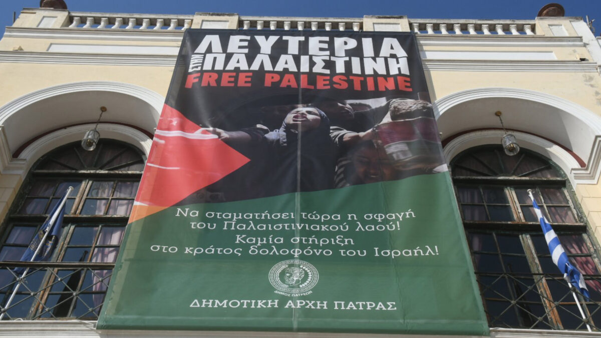 Την αλληλεγγύη της στον σκληρά δοκιμαζόμενο Παλαιστινιακό λαό, εκφράζει η δημοτική Αρχή Πάτρας και με γιγαντοπανό που αναρτήθηκε το απόγευμα της Παρασκευής από τα μέλη της στο Μέγαρο Λόγου και Τέχνης στην πλατεία Γεωργίου.