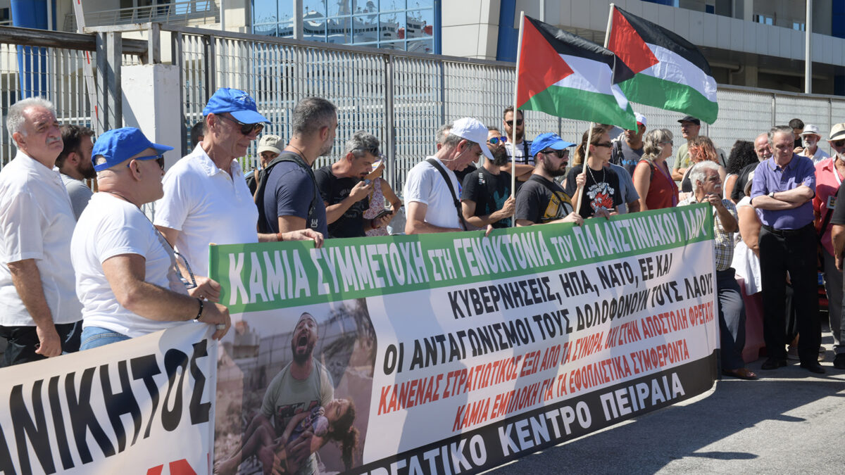 Οι εργαζόμενοι του Πειραιά από την πρώτη στιγμή εκφράσαμε την αλληλεγγύη μας στον επί δεκαετίες δοκιμαζόμενο λαό της Παλαιστίνης. Οργανώσαμε με κάθε τρόπο την πάλη μέσα από τα σωματεία μας, ώστε να αποτρέψουμε την εμπλοκή της χώρας μας σε αυτό το μακελειό. Μπλοκάραμε τη φόρτωση και μεταφορά σφαιρών που προορίζονταν για τα κορμιά των Παλαιστινίων. Αποτρέψαμε τον ελλιμενισμό πλοίων φορτωμένων με πολεμικό υλικό. Βροντοφωνάξαμε να μην εμπλακεί καμία ελληνική φρεγάτα στη σφαγή που συντελείται στην ευρύτερη περιοχή της Μέσης Ανατολής.