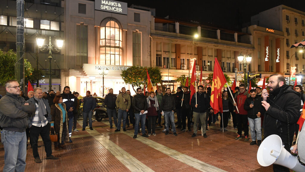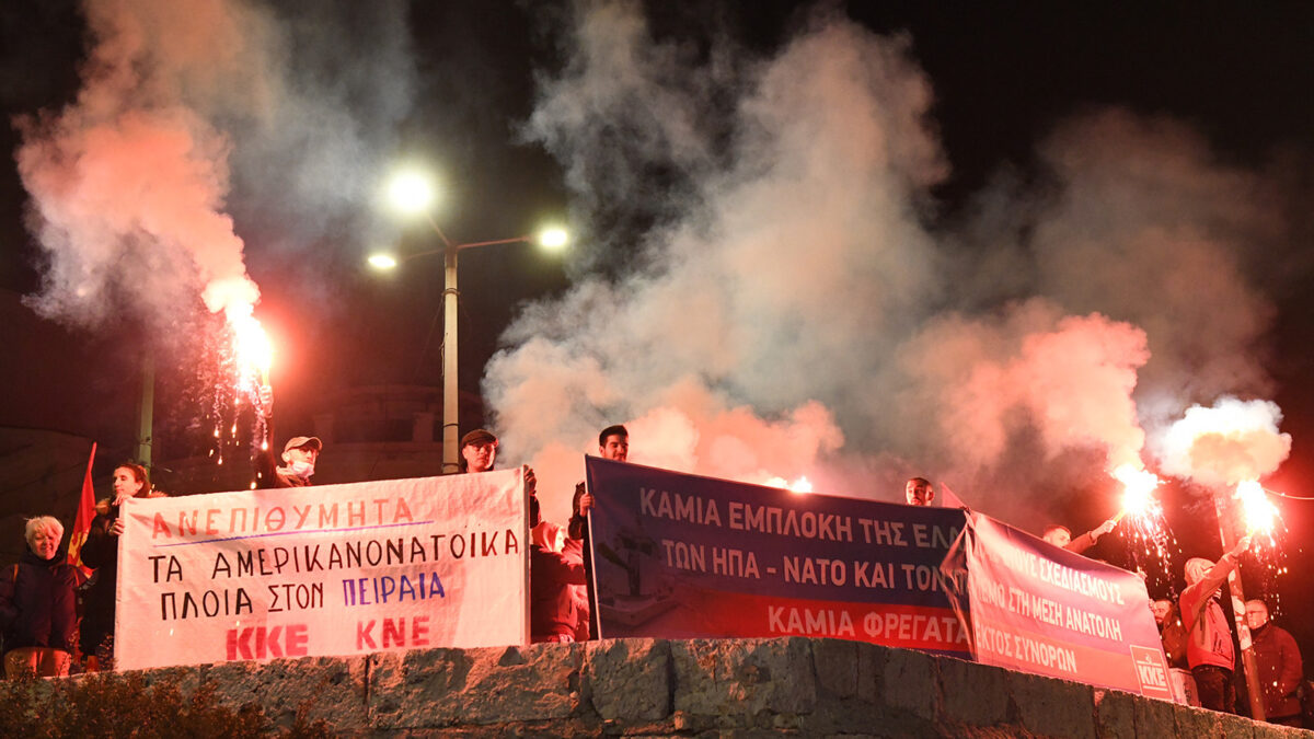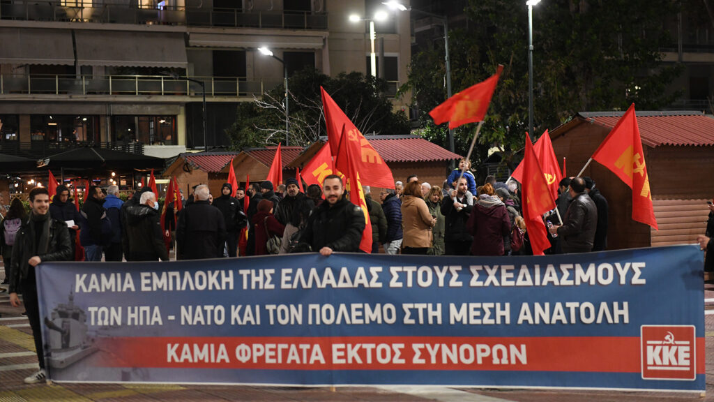 «Καμιά εμπλοκή της Ελλάδας στους σχεδιασμούς των ΗΠΑ -ΝΑΤΟ και τον πόλεμο στη Μέση Ανατολή. Καμιά φρεγάτα εκτός συνόρων», έγραφε το πανό.