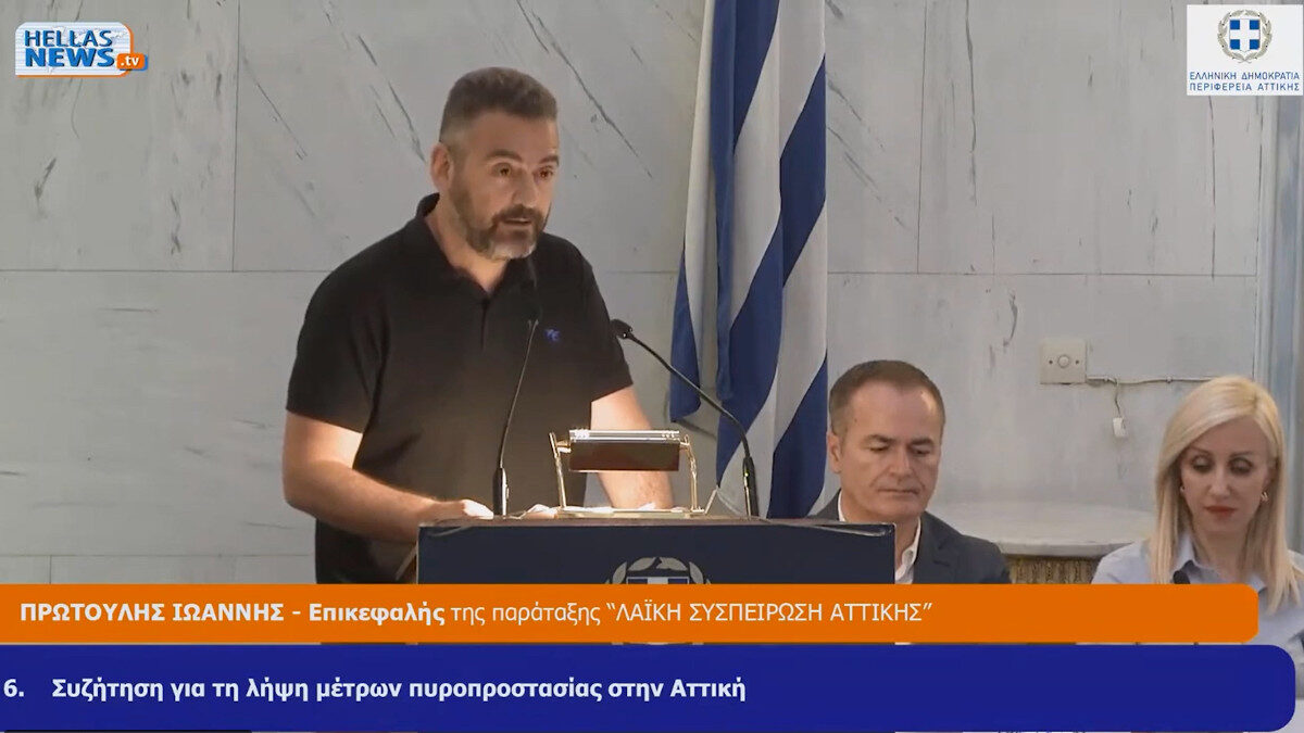 Στη συζήτηση για τη λήψη μέτρων πυροπροστασίας στην Αττική, στη συνεδρίαση του Περιφερειακού Συμβουλίου, τοποθετήθηκε εκ μέρους της «Λαϊκής Συσπείρωσης» ο επικεφαλής της και μέλος του ΠΓ της ΚΕ του ΚΚΕ, Γιάννης Πρωτούλης.