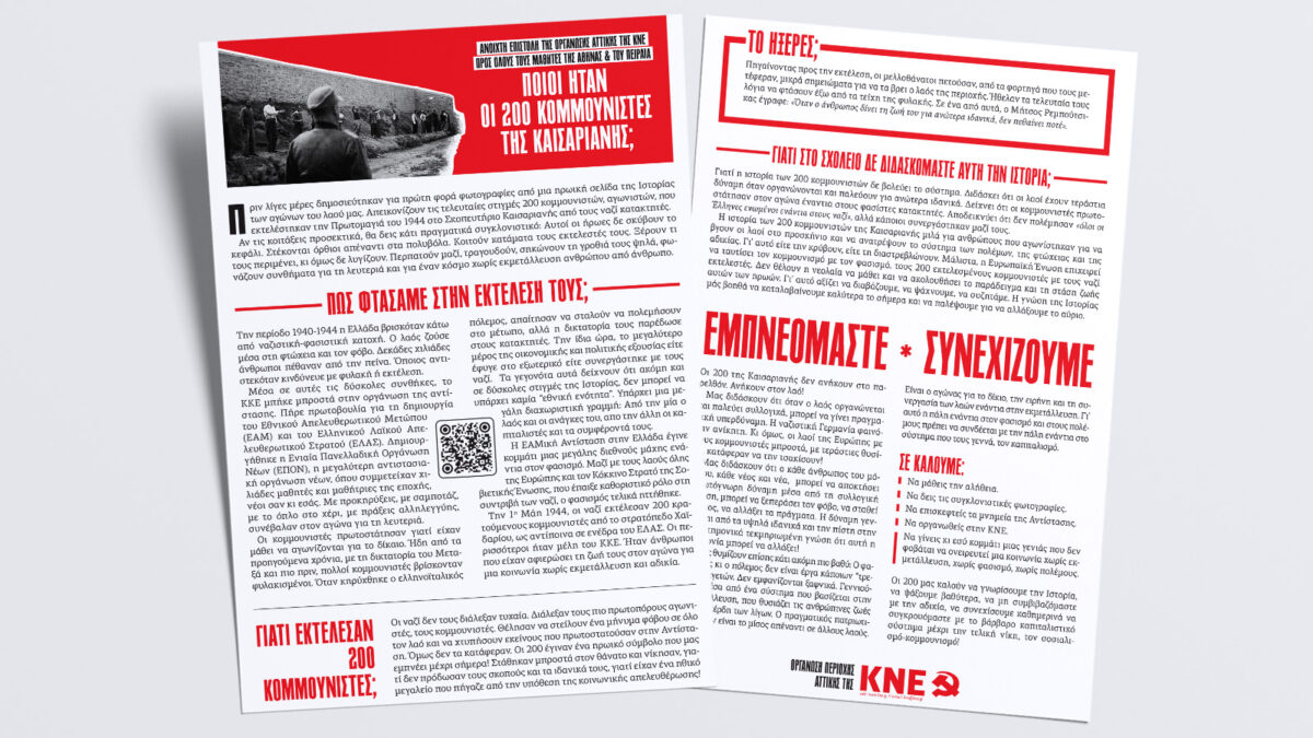 Με ανοιχτή επιστολή του, το ΣΠ Αττικής της ΚΝΕ απευθύνει κάλεσμα στους μαθητές να γνωρίσουν την Ιστορία, να αναζητήσουν την αλήθεια και να εμπνευστούν από τις συγκλονιστικές φωτογραφίες της εκτέλεσης των 200 κομμουνιστών.