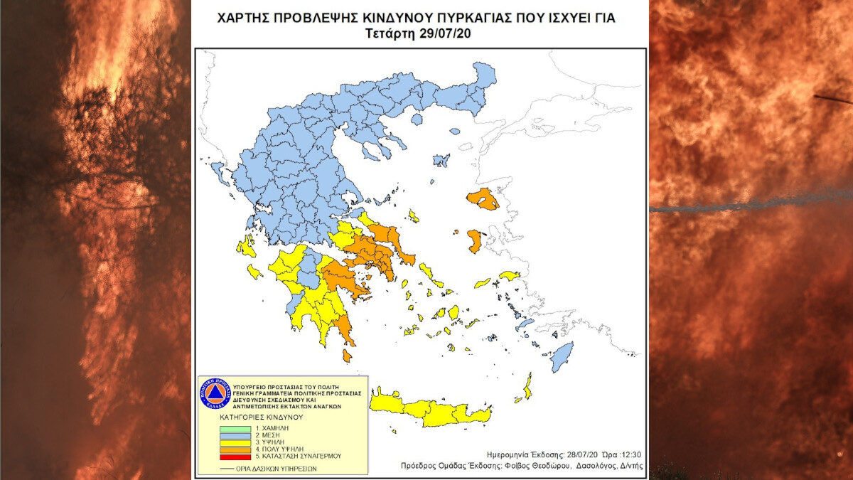 Σύμφωνα με το Χάρτη Πρόβλεψης Κινδύνου Πυρκαγιάς που εκδίδει η Γενική Γραμματεία Πολιτικής Προστασίας για σήμερα, Τετάρτη 29 Ιουλίου 2020, προβλέπεται πολύ υψηλός κίνδυνος πυρκαγιάς (κατηγορία κινδύνου 4) σε Αττική, Βοιωτία, Εύβοια, Κορινθία, Αργολίδα, Λακωνία, Κύθηρα, Λέσβο & Χίο.