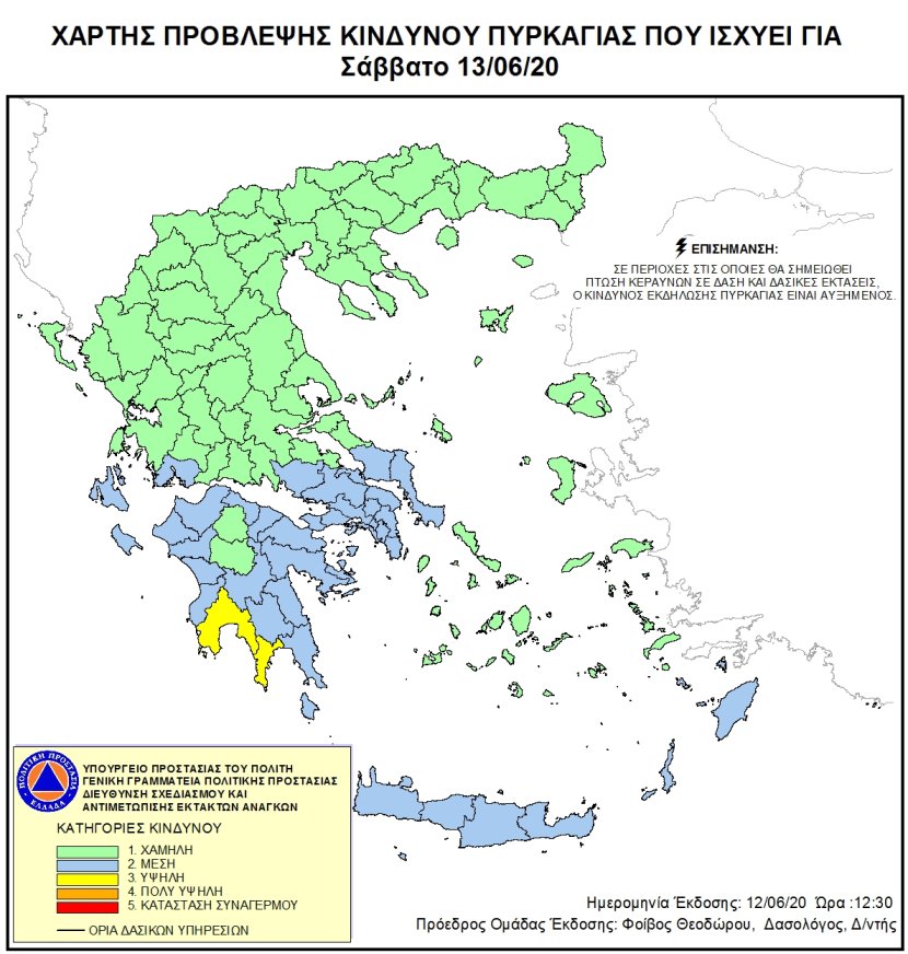 Σύμφωνα με τη Γενική Γραμματεία Πολιτικής Προστασίας και το χάρτη ο κίνδυνος πυρκαγιάς παραμένει ΧΑΜΗΛΟΣ στις περισσότερες περιοχές της χώρας καθώς και ΜΕΤΡΙΟΣ σε κεντρικές και νότιες. Ενώ στη Μεσσηνία και την Αρκαδία είναι ΥΨΗΛΟΣ.