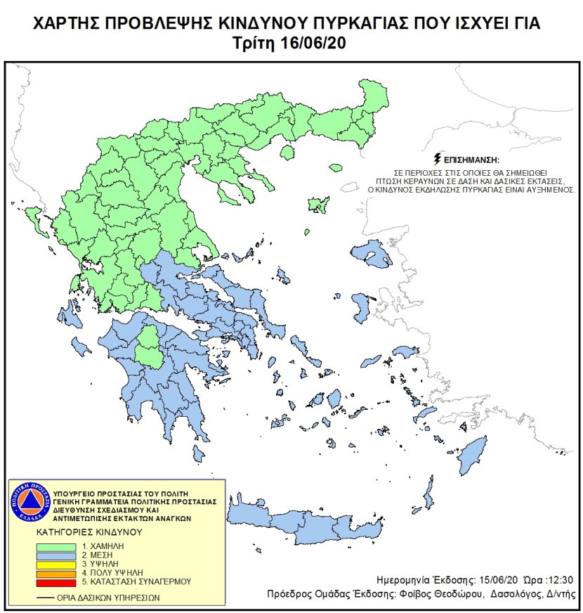 Σύμφωνα με τη Γενική Γραμματεία Πολιτικής Προστασίας και το Χάρτη Πρόβλεψης Κινδύνου Πυρκαγιάς που εκδίδει, για σήμερα Τρίτη 16 Ιουνίου, προβλέπεται μέσος κίνδυνος πυρκαγιάς (κατηγορία κινδύνου 2) σε περιοχές της Στερεάς Ελλάδας, Πελοποννήσου, Κρήτης, Επτανήσων, Δωδεκανήσων, Κυκλάδων, Νησιά Ανατ. Αιγαίου.