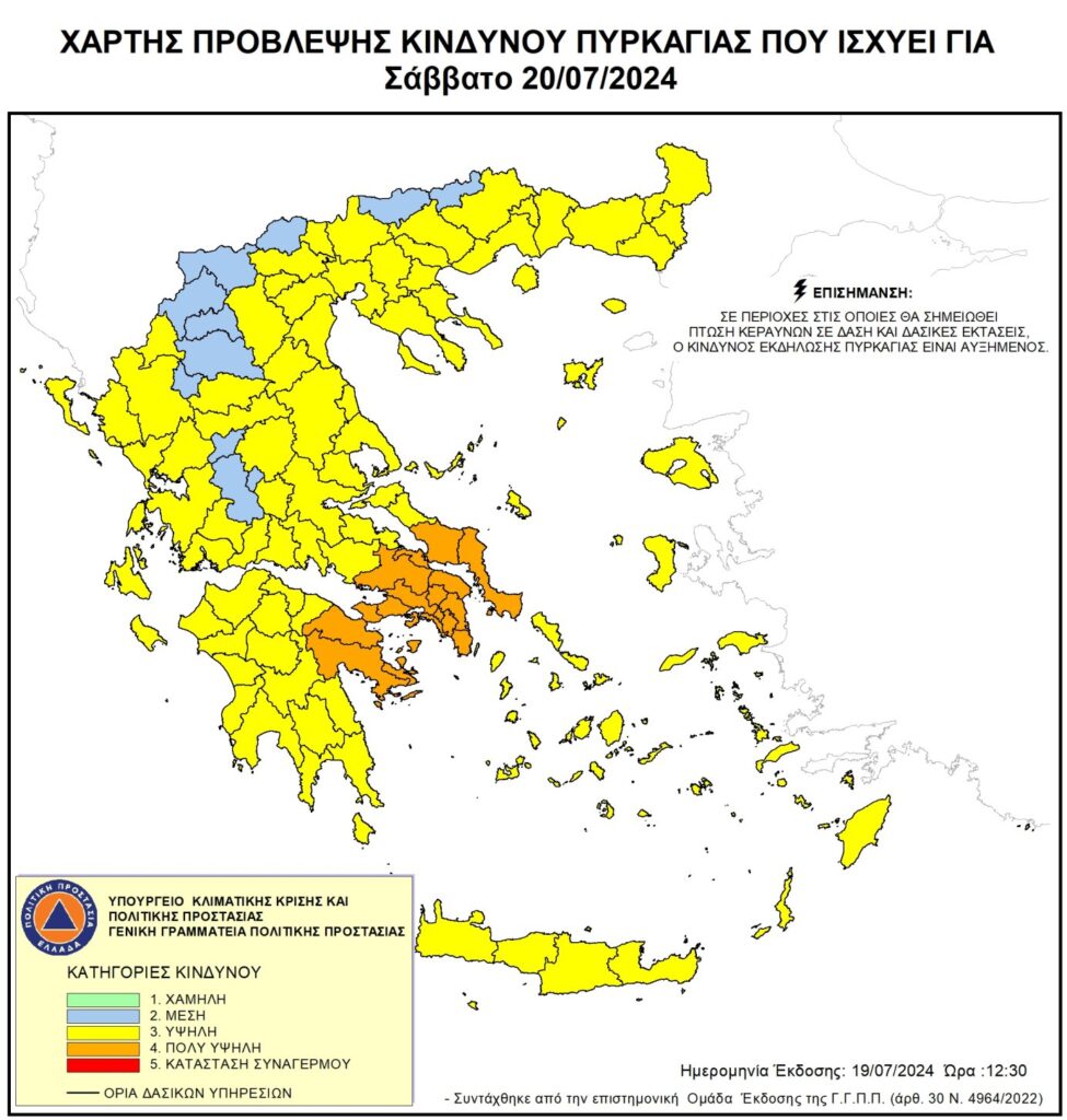 Πολύ υψηλός κίνδυνος πυρκαγιάς (κατηγορία κινδύνου 4) προβλέπεται αύριο στην περιφέρεια Αττικής και σε περιοχές της Πελοποννήσου και της Στερεάς Ελλάδας, σύμφωνα με το Χάρτη Πρόβλεψης Κινδύνου Πυρκαγιάς που εκδίδει η γενική γραμματεία Πολιτικής Προστασίας του υπουργείου Κλιματικής Κρίσης και Πολιτικής Προστασίας .