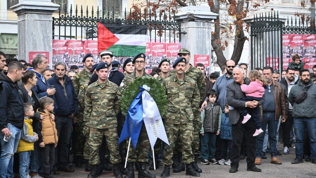 «Οι φαντάροι είναι του λαού παιδιά, έξω από τα σύνορα δεν έχουνε δουλειά» και «Λευτεριά στην Παλαιστίνη» ήταν τα συνθήματα που απλώθηκαν στο χώρο του Πολυτεχνείου από τον πολύ κόσμο που βρίσκονταν εκείνη την ώρα εκεί την ώρα που νέοι στρατευμένοι προσέγγιζαν το μνημείο για να καταθέσουν στεφάνι.