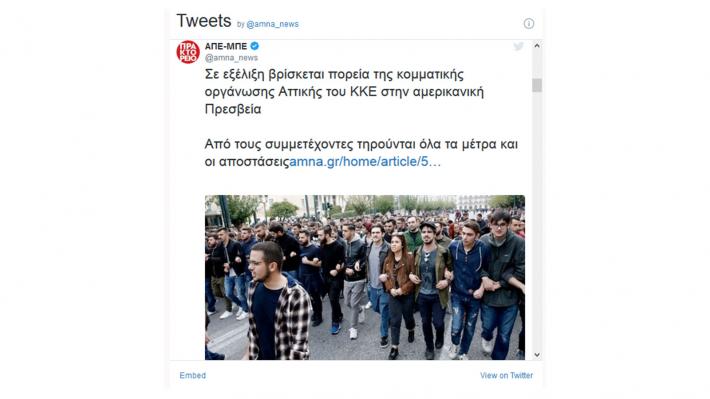 Απαράδεκτους συνειρμούς επιχειρεί να καλλιεργήσει το ειδησεογραφικό πρακτορείο ΑΠΕ – ΜΠΕ, φλερτάροντας με τη συκοφάντηση. Συγκεκριμένα, το ΑΠΕ – ΜΠΕ, με φωτογραφία από άλλη συγκέντρωση, που πραγματοποιήθηκε προφανώς σε άλλο χρόνο και όχι από τη σημερινή συγκέντρωση του ΚΚΕ, εικονογραφεί την είδηση για την κατάθεση στεφάνου εκ μέρους του ΚΚΕ και της ΚΝΕ, και την συγκέντρωση έξω από την αμερικάνικη πρεσβεία και το Πάρκο Ελευθερίας, που πραγματοποίησαν δυνάμεις της ΚΟ Αττικής του ΚΚΕ στο πλαίσιο του συμβολικού αγωνιστικού εορτασμού της επετείου του Πολυτεχνείου! Φυσικά, δεν αναφέρει πουθενά ότι πρόκειται για φωτογραφία αρχείου.