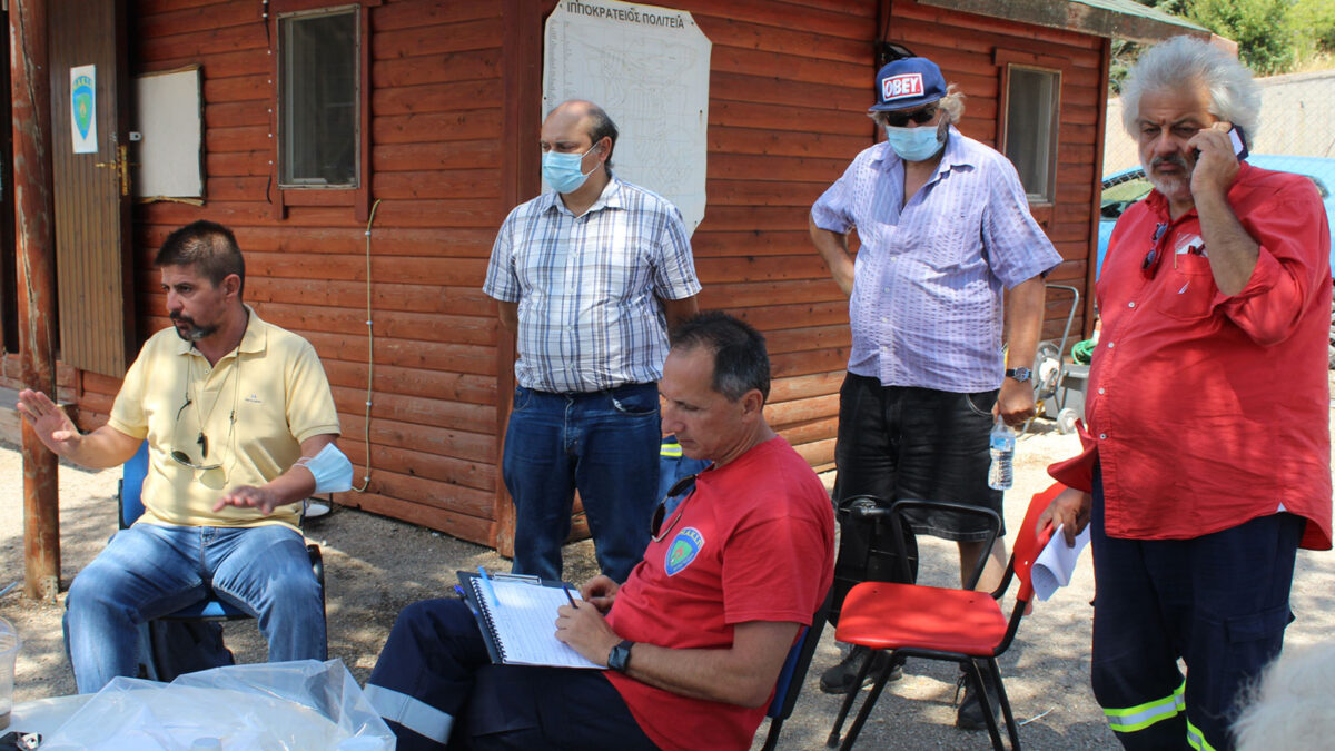 Στην συνέχεια το κλιμάκιο συναντήθηκε με τους εθελοντές πυροσβέστες της Ιπποκράτειου Πολιτείας-ΜΑΚΙΠ, όπου ενημερώθηκαν για την μάχη που έδωσαν με τις φλόγες για να προστατεύσουν ανθρώπινες ζωές, περιουσίες και το δάσος. Ιδιαίτερη έμφαση δόθηκε στην ανυπαρξία προετοιμασίας και της έλλειψης σχεδιασμού από όλες τις βαθμίδες του κρατικού μηχανισμού με τραγικότερο παράδειγμα το ότι την στιγμή που οι εθελοντές πάλευαν με τις φλόγες η περιοχή έμεινε χωρίς νερό, λόγω διακοπής του ρεύματος και έλλειψης γεννητριών στα αντλιοστάσια με αποτέλεσμα να κινδυνέψουν ακόμα και οι ίδιοι από την πυρκαγιά. Τόνισαν πως, παρόλο που πάλευαν μόνοι και με λιγοστά μέσα με τις φλόγες, αν είχαν νερό καθ’ όλη την διάρκεια της πυρκαγιάς θα ήταν σε θέση να περιορίσουν σε μεγάλο βαθμό την καταστροφή.
