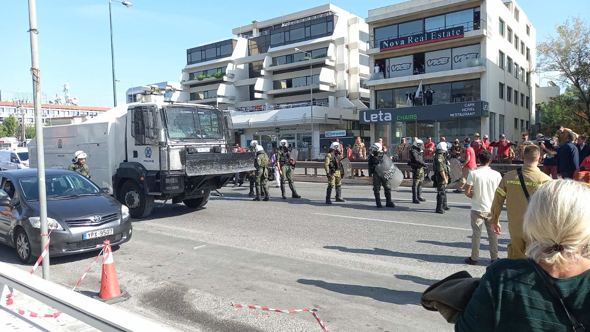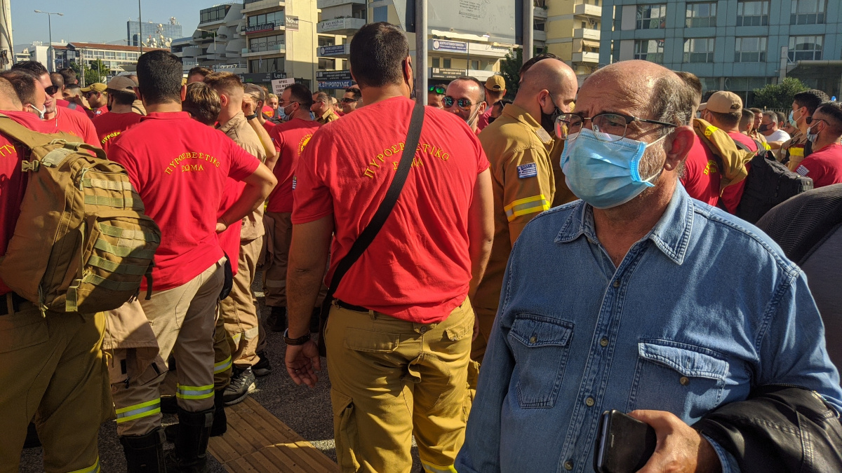Στην ένστολη διαμαρτυρία των πυροσβεστών παραβρίσκεται ο Νίκος Παπαναστάσης, Αντισυνταγματάρχης (ΕΔ) ε.α. και Βουλευτής του ΚΚΕ και Μπάμπης Βορτελίνος, εκ μέρους του ΠΑΜΕ.