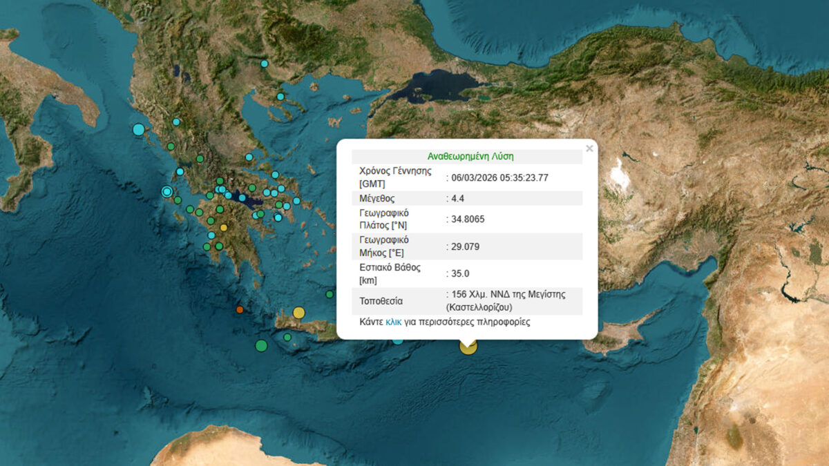 Σεισμική δόνηση μεγέθους 4,4 βαθμών της κλίμακας Ρίχτερ, σημειώθηκε στις 7.35 π.μ. στο θαλάσσιο χώρο 156 χλμ. νότια – νοτιοδυτικά της Μεγίστης, μεταξύ Καρπάθου και Κύπρου.