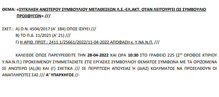 Σύγκληση Ανώτερου Συμβουλίου Μεταθέσεων Λ.Σ.-ΕΛ.ΑΚΤ. όταν λειτουργεί ως Συμβούλιο Προσφυγών