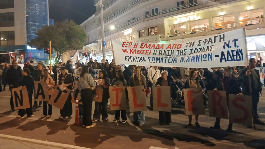 Εργατικά σωματεία, αγροτικοί σύλλογοι, φοιτητές, μαθητές και μαζικοί φορείς σε όλη την Κρήτη διαδήλωσαν ζητώντας εδώ και τώρα την απεμπλοκή της χώρας από τον ιμπεριαλιστικό πόλεμο, να κλείσουν οι βάσεις στη Σούδα και παντού στη χώρα γιατί είναι ορμητήρια πολέμου και μαγνήτης αντιποίνων, να ανακληθεί η πυροβολαρχία «Patriot» από τη Σαουδική Αραβία, να επιστρέψει η Φρεγάτα από την Ερυθρά Θάλασσα, να επιστρέψει κάθε πολεμικό πλοίο και στρατιωτική μονάδα από ιμπεριαλιστικές αποστολές στο εξωτερικό και να μην πληρώσουν οι εργαζόμενοι τις συνέπειες του πολέμου τους.