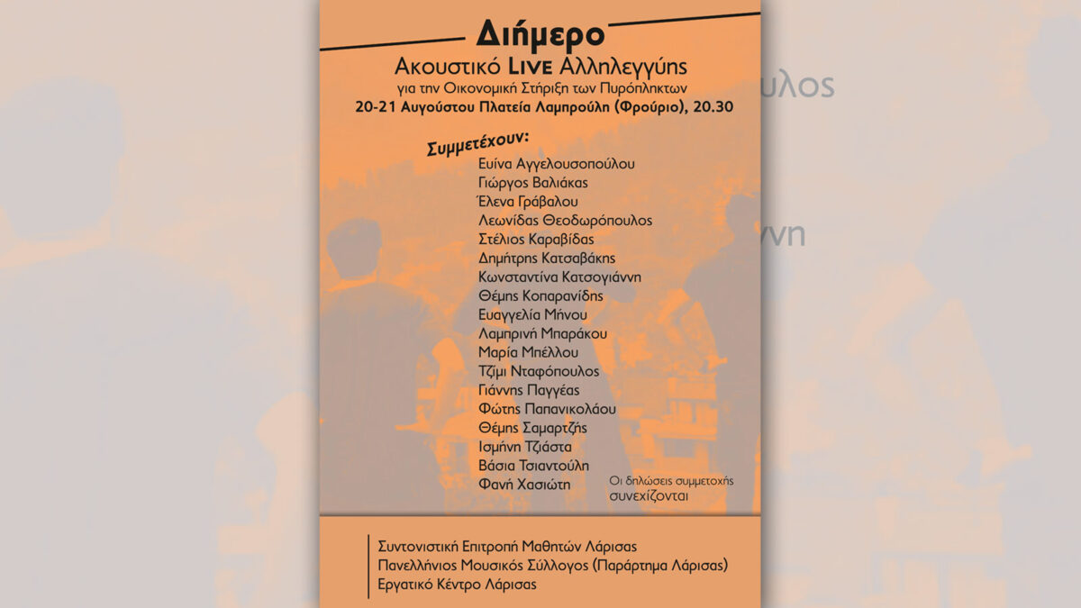 Διήμερη ακουστική συναυλία αλληλεγγύης στους πυρόπληκτους κατοίκους της Εύβοιας διοργανώνει η Συντονιστική Επιτροπή Μαθητών Λάρισας, 20-21 Αυγούστου, στην Πλατεία Λαμπρούλη (Φρούριο) στις τις 8.30 μ.μ., με τη στήριξη του Παραρτήματος Λάρισας του Πανελλήνιου Μουσικού Συλλόγου και του Εργατικού Κέντρου ν. Λάρισας.