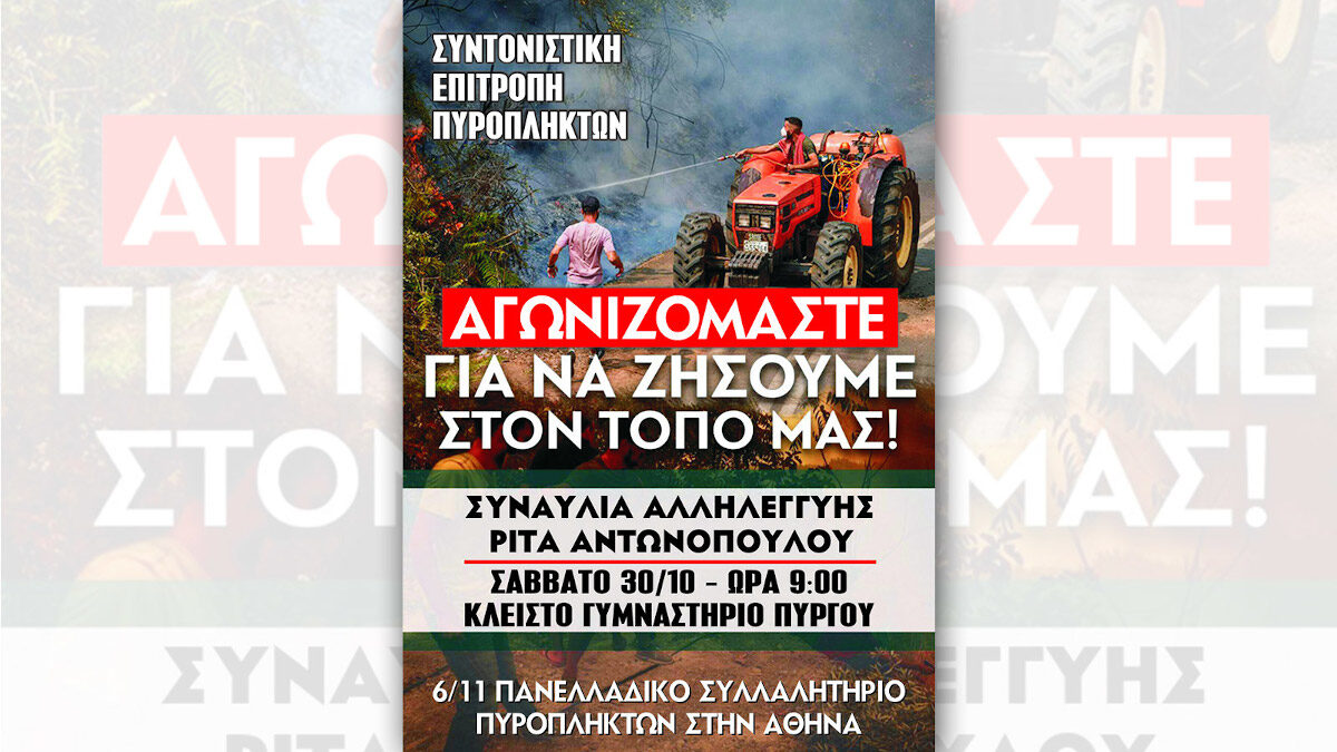 Έχοντας σταθερό πρόγραμμα κινητοποιήσεων μπροστά μας έχουμε την μεγάλη συναυλία αλληλεγγύης με τη Ρίτα Αντωνοπούλου στον Πύργο το Σάββατο 30 Οκτώβρη στις 9:00 μ.μ. στο Κλειστό Γυμναστήριο Πύργου, καθώς και την συμμετοχή μας στο μεγάλο πανελλαδικό συλλαλητήριο των πληγέντων στις 6 Νοέμβρη στην Αθήνα. Για την επιτυχία τους, καθημερινά πραγματοποιούνται περιοδείες στα πυρόπληκτα χωριά, γίνονται συναντήσεις και συσκέψεις, με στόχο αυτό που θέσαμε από την πρώτη στιγμή των καταστροφών, “να μην μείνει κανένας μόνος του”, αφού πλέον αποδεικνύεται καθημερινά πως “μόνο ο λαός μπορεί να σώσει το λαό”.