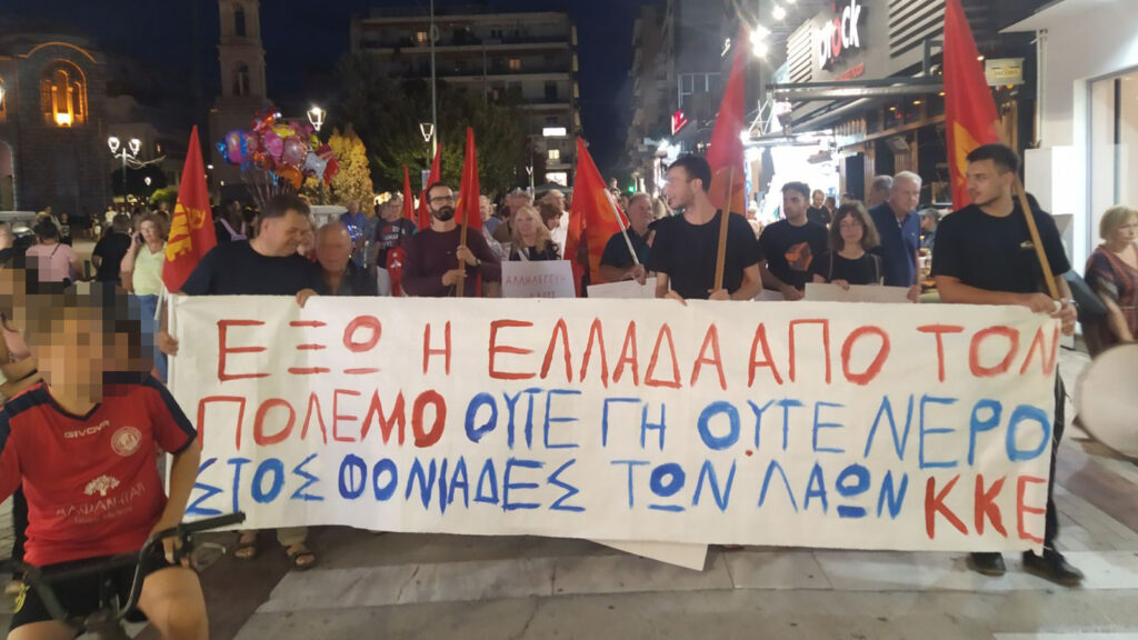 Φωνάζοντας συνθήματα όπως «Διέξοδο από τον πόλεμο θα δώσει ο λαός, ανίκητος δεν είναι ο ιμπεριαλισμός», «Καμία εμπλοκή, καμιά συμμετοχή, έξω από την Ελλάδα οι ΝΑΤΟϊκοί» και μοιράζοντας την ανακοίνωση του Γραφείου Τύπου της ΚΕ του ΚΚΕ εξέφρασαν την αλληλεγγύη τους στους λαούς που ματώνουν εξαιτίας των ιμπεριαλιστικών επεμβάσεων και πολέμων, ενώ κατήγγειλαν την κυβέρνηση της ΝΔ που παίζει τον ρόλο του συνηγόρου των ισραηλινών εγκλημάτων, συμμετέχοντας ενεργά στους αμερικανοΝΑΤΟικούς σχεδιασμούς στήριξης του Ισραήλ, που οδηγούν τον λαό και τη χώρα σε πολεμική εμπλοκή με απρόβλεπτες διαστάσεις.