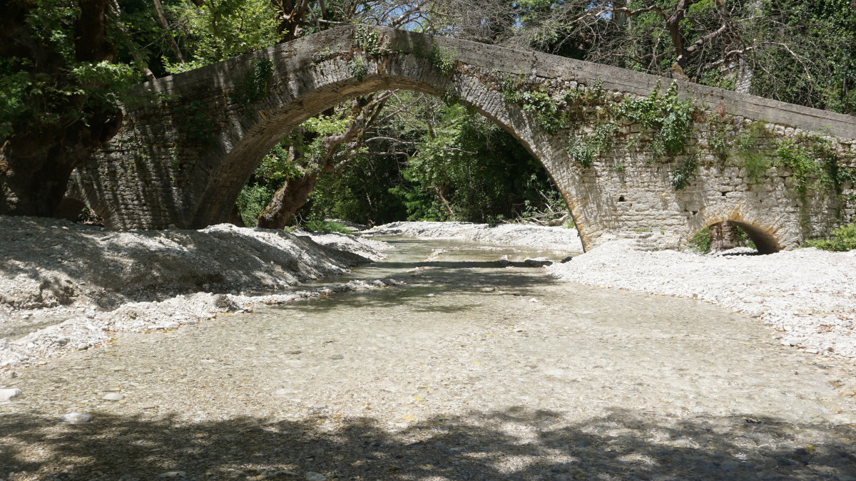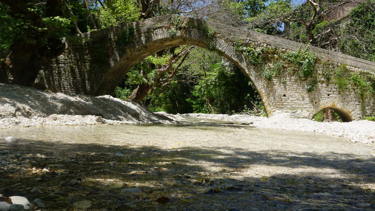 Μπαίνουμε στο νομό Ιωαννίνων. Κατεβαίνοντας πλέον το βουνό, στέκουν απέναντί μας με τα τελευταία χιόνια πάνω στις κορφές, ενώ εμείς λιώνουμε στους 30 βαθμούς μέσα στον “πύραυλο”… Κάνουμε στάση στο χωριό Βροσίνα, γιατί μας έκανε εντύπωση το όμορφο πέτρινο γεφύρι που ενώνει το χωριό πάνω από τον Ζαλογγοπόταμο.