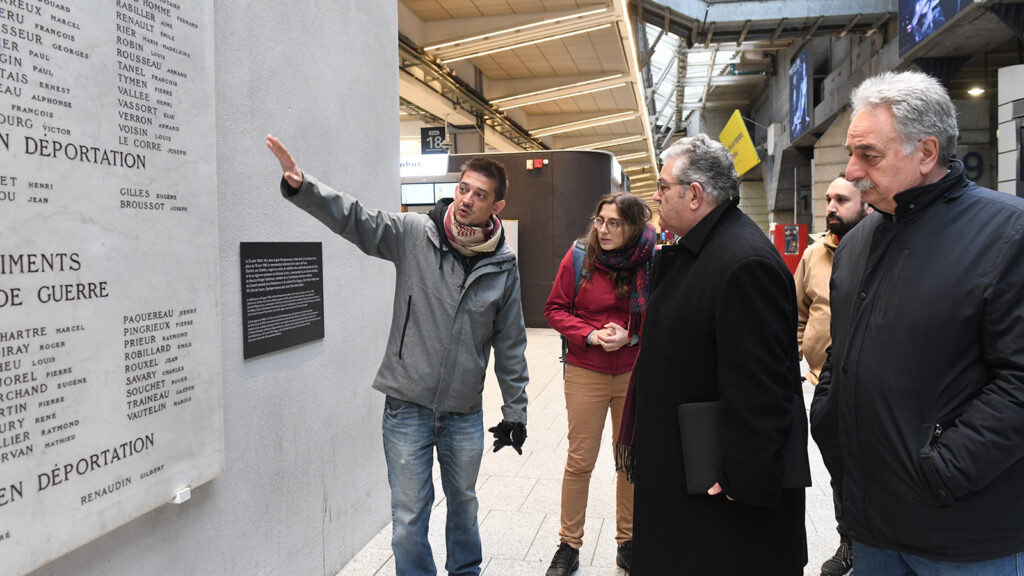 Νωρίτερα, οι συνδικαλιστές έδειξαν στον Δημήτρη Κουτσούμπα το μνημείο που έχει στηθεί στο σημείο που τα γερμανικά ναζιστικά στρατεύματα κατοχής παραδόθηκαν στους ένοπλους εργάτες του Παρισιού.