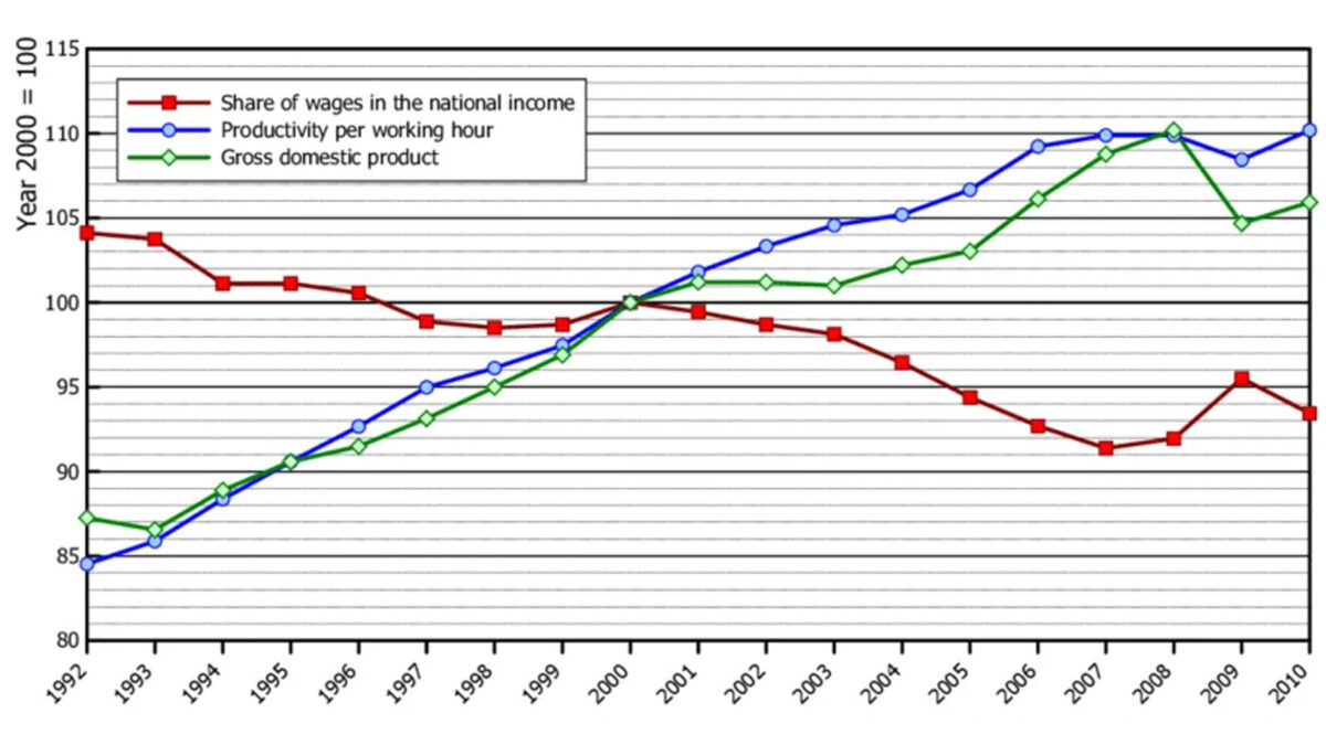 Το 1992-2010 το μερίδιο των μισθών ως ποσοστού του ΑΕΠ έπεσε πάνω από 10%, ενώ την ίδια περίοδο το ΑΕΠ αυξήθηκε κατά 25%