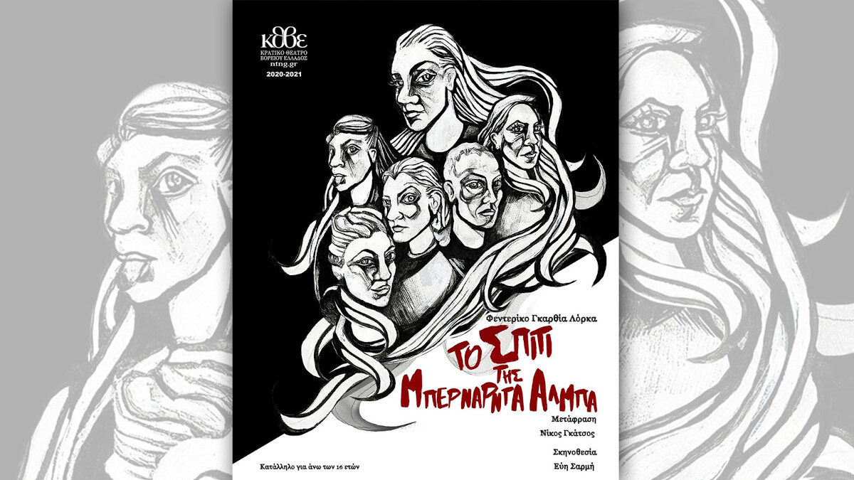 Προσκεκλημένοι του ΚΘΒΕ, σ’ ένα σπίτι όπου οι γυναίκες πενθούν την ίδια τη ζωή και τις χαρές της, θα μεταφερθούμε διαδικτυακά στο φτωχικό χωριό της ισπανικής υπαίθρου στις αρχές του 20ού αιώνα. Εκεί η Μπερνάρντα, μια μορφή ηγετική και μαζί τυραννική, έχοντας χάσει τον δεύτερο σύζυγό της, επιβάλλει οκταετή εγκλεισμό στις θυγατέρες της. Σε μια προσπάθεια να διατηρήσει την τιμή και την αξιοπρέπεια της οικογένειάς της, θέτει αυστηρούς κανόνες, όρους και όρια, στερώντας την ελευθερία τους. Η Ανγκούστιας, η ετεροθαλής πρωτότοκη, κληρονομώντας τον πατέρα της (τον πρώτο άνδρα της Μπερνάρντα), γίνεται η εκλεκτή του νεαρού Πέπε Ρομάνο, με τον οποίο όλες οι αδερφές είναι ερωτευμένες κατά κάποιον τρόπο. Η Αδέλα όμως (το στερνοπαίδι της οικογένειας) είναι εκείνη που θα βρεθεί στην αγκαλιά του μυστικά και ανυπόταχτα και θα συγκρουστεί με τους αυστηρούς κοινωνικούς κανόνες…