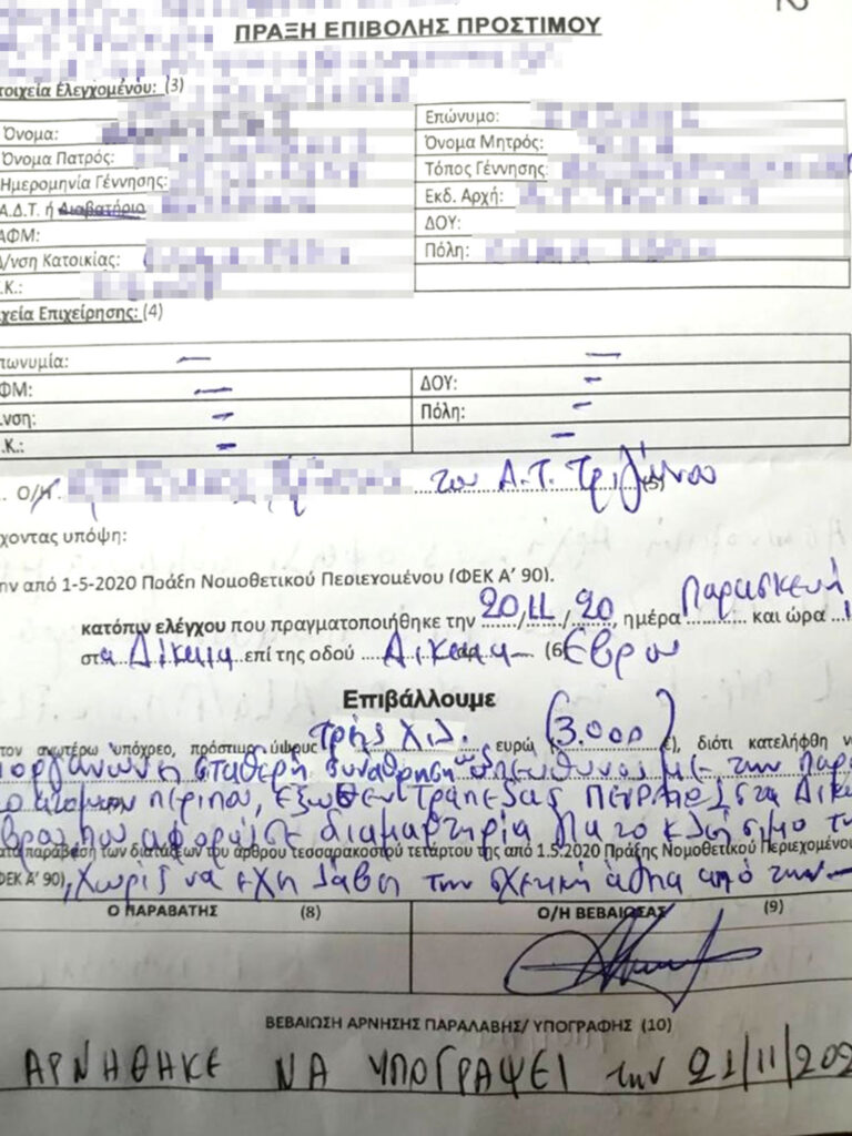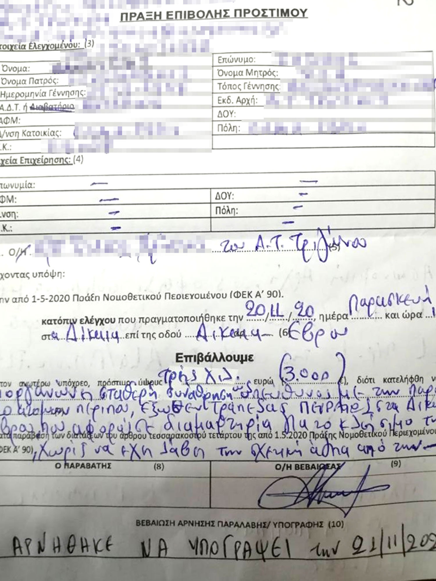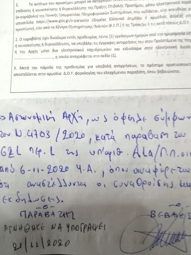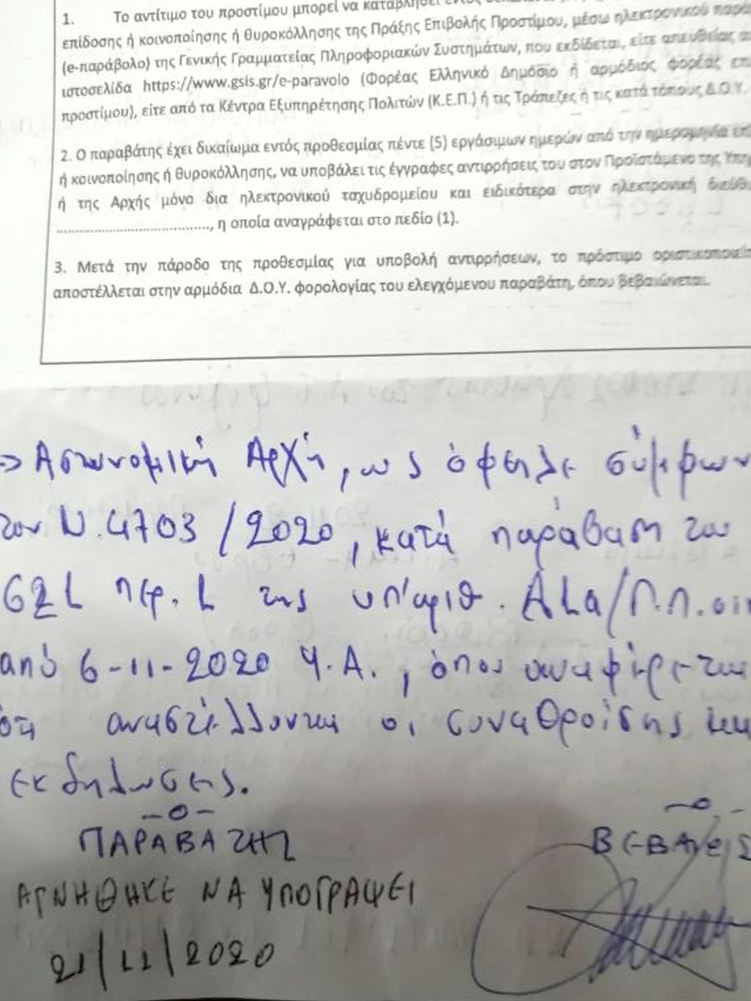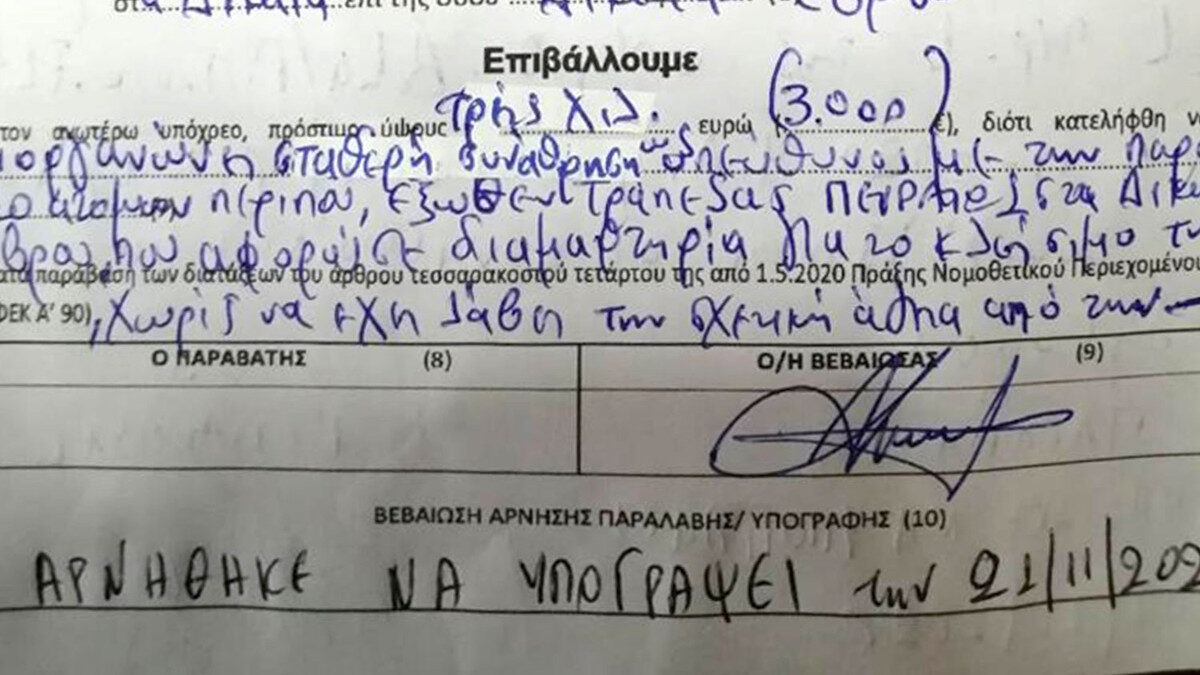 Από τις «προβλεπόμενες διαδικασίες» προέκυψε το συγκεκριμένο απαράδεκτο πρόστιμο, το οποίο παρέδωσαν οι αστυνομικοί την επομένη, Σάββατο 21 Νοέμβρη, στο σπίτι του προέδρου του Συλλόγου. Πρόκειται για μια πρωτοφανή προσπάθεια παρεμπόδισης της συνδικαλιστικής δράσης, παρά το γεγονός ότι οι συμμετέχοντες τήρησαν όλα τα απαραίτητα μέτρα προστασίας της δημόσιας υγείας (αποστάσεις, μάσκες κλπ.)